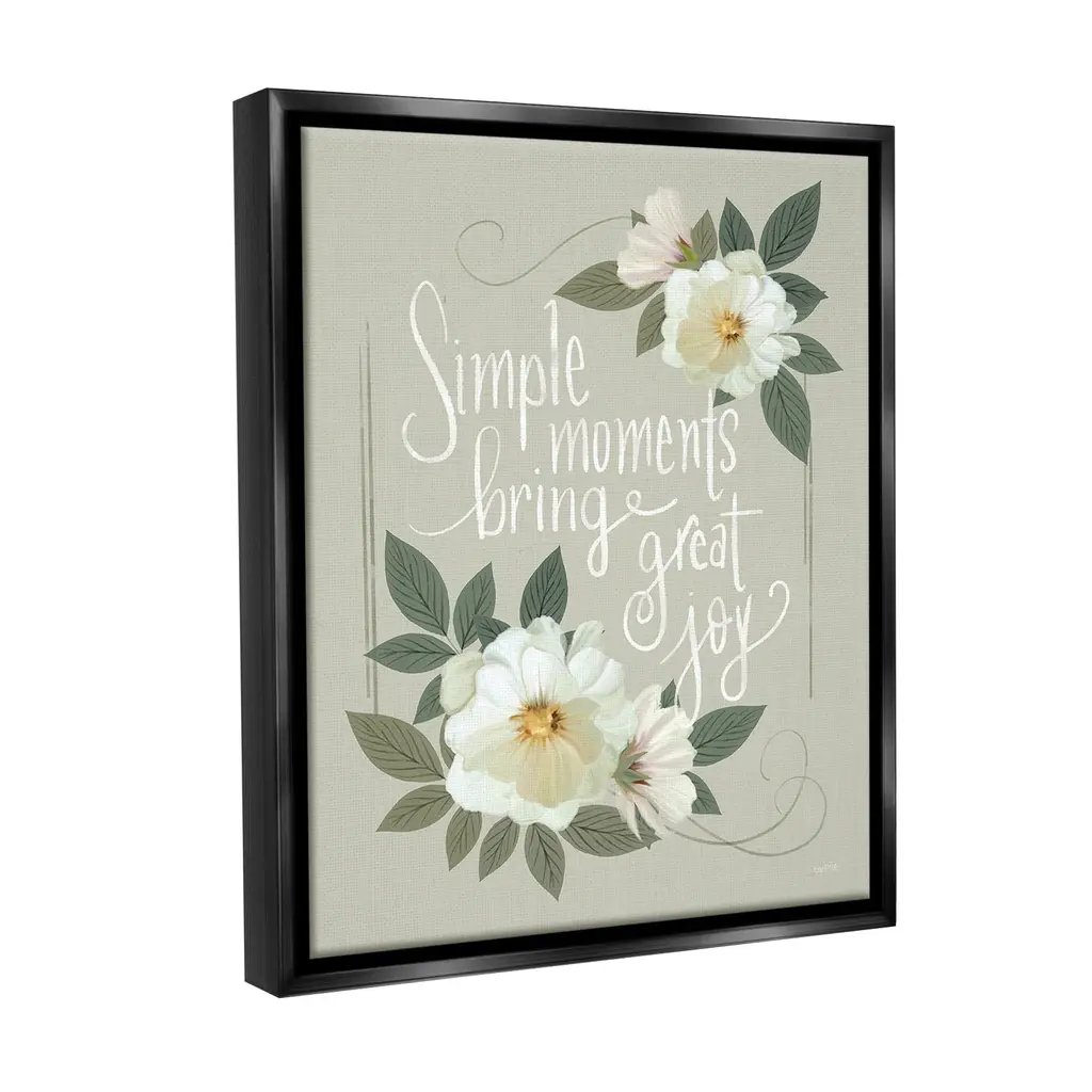 Elevate your home or office to the next level with Stupell Framed Floating Canvas Wall Art. Our premium hand-stretched canvas is mounted securely into a sturdy lightweight frame. The museum-style gap between the wrapped canvas and the box frame gives the illusion of floating artwork. Stupell Wall Art is made in the USA.Features: Dimensions: 17 x 1.7 x 21 Frame, 16 x 1.5 x 20 Canvas ArtFloating Frame Canvas Products are available in sizes 17"x21" and 25"x31". All Floating Frame Canvas Products have a 1.7" Depth.Wall Art is Ready to Hang with Hardware Free Hanging. No Installation required. For Easy Set Up Lean or Layer Artwork on Shelf or Against Wall. Artwork is Permently Fixed into the Frame.Our elevated 1.7" Thick Floating Frame is the perfect complement to our canvas style Wall Art. We use only the highest quality inks in house with industry leading printing solutions. Canvas is hand stretched over a durable wood foundation and then mounted securly into a Modern Box Frame. Made in the USA.Artwork Relates To: Floral, Flower, Border, Blossom, Cottage, Phrase, Inspirational, Simple Moments Bring Great JoyDesign by House Fenway