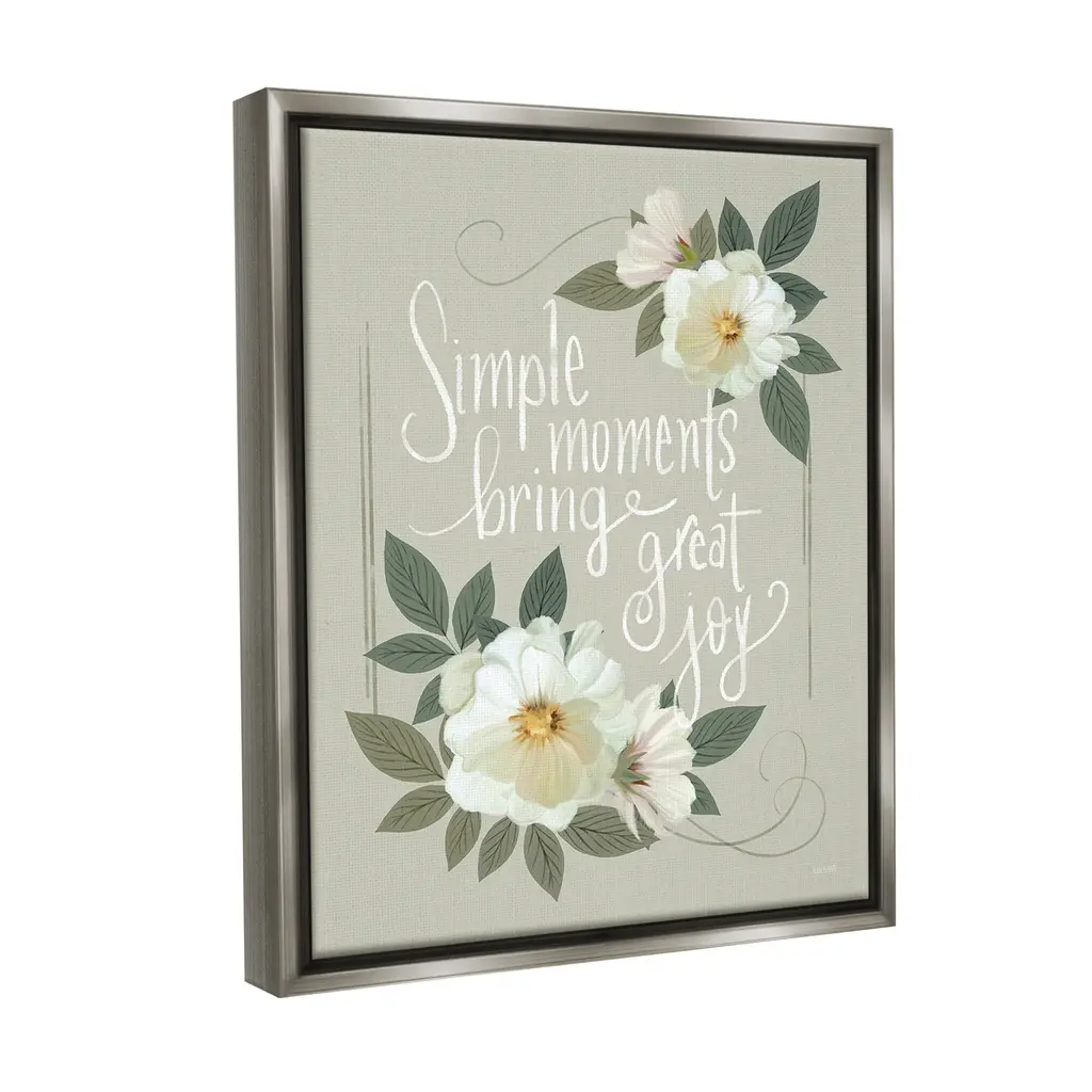 Elevate your home or office to the next level with Stupell Framed Floating Canvas Wall Art. Our premium hand-stretched canvas is mounted securely into a sturdy lightweight frame. The museum-style gap between the wrapped canvas and the box frame gives the illusion of floating artwork. Stupell Wall Art is made in the USA.Features: Dimensions: 17 x 1.7 x 21 Frame, 16 x 1.5 x 20 Canvas ArtFloating Frame Canvas Products are available in sizes 17"x21" and 25"x31". All Floating Frame Canvas Products have a 1.7" Depth.Wall Art is Ready to Hang with Hardware Free Hanging. No Installation required. For Easy Set Up Lean or Layer Artwork on Shelf or Against Wall. Artwork is Permently Fixed into the Frame.Our elevated 1.7" Thick Floating Frame is the perfect complement to our canvas style Wall Art. We use only the highest quality inks in house with industry leading printing solutions. Canvas is hand stretched over a durable wood foundation and then mounted securly into a Modern Box Frame. Made in the USA.Artwork Relates To: Floral, Flower, Border, Blossom, Cottage, Phrase, Inspirational, Simple Moments Bring Great JoyDesign by House Fenway