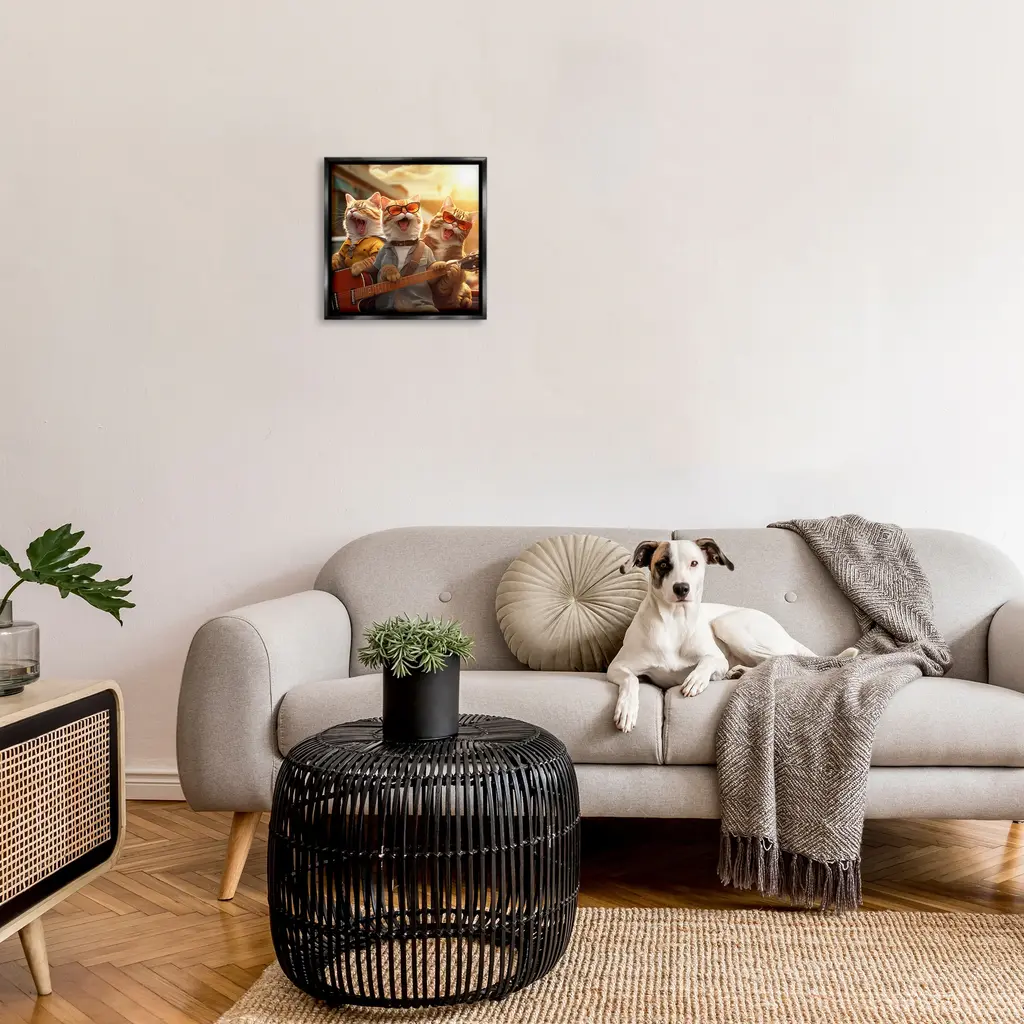 Elevate your home or office to the next level with Stupell Framed Floating Canvas Wall Art. Our premium hand-stretched canvas is mounted securely into a sturdy lightweight frame. The museum-style gap between the wrapped canvas and the box frame gives the illusion of floating artwork. Stupell Wall Art is made in the USA.Features: Dimensions: 18 x 1.7 x 18 Frame, 17 x 1.5 x 17 Canvas ArtFloating Frame Canvas Products are available in sizes 18"x18" and 25"x25". All Floating Frame Canvas Products have a 1.7" Depth.Wall Art is Ready to Hang with Hardware Free Hanging. No Installation required. For Easy Set Up Lean or Layer Artwork on Shelf or Against Wall. Artwork is Permently Fixed into the Frame.Our elevated 1.7" Thick Floating Frame is the perfect complement to our canvas style Wall Art. We use only the highest quality inks in house with industry leading printing solutions. Canvas is hand stretched over a durable wood foundation and then mounted securly into a Modern Box Frame. Made in the USA.Artwork Relates To: Animal, Cat, Mammal, Pet, Humor, Funny, Music, Musician, GuitarDesign by Jim Baldwin