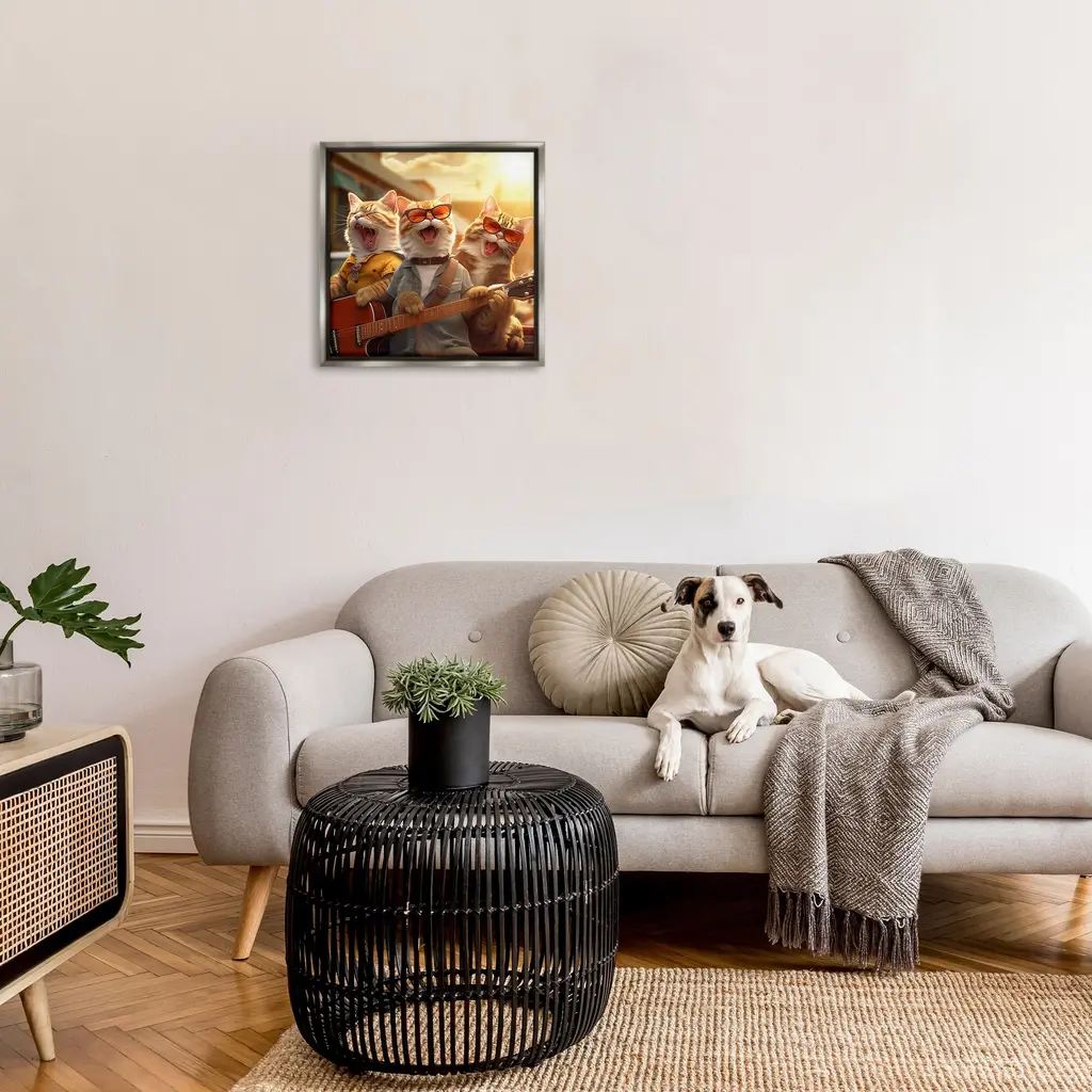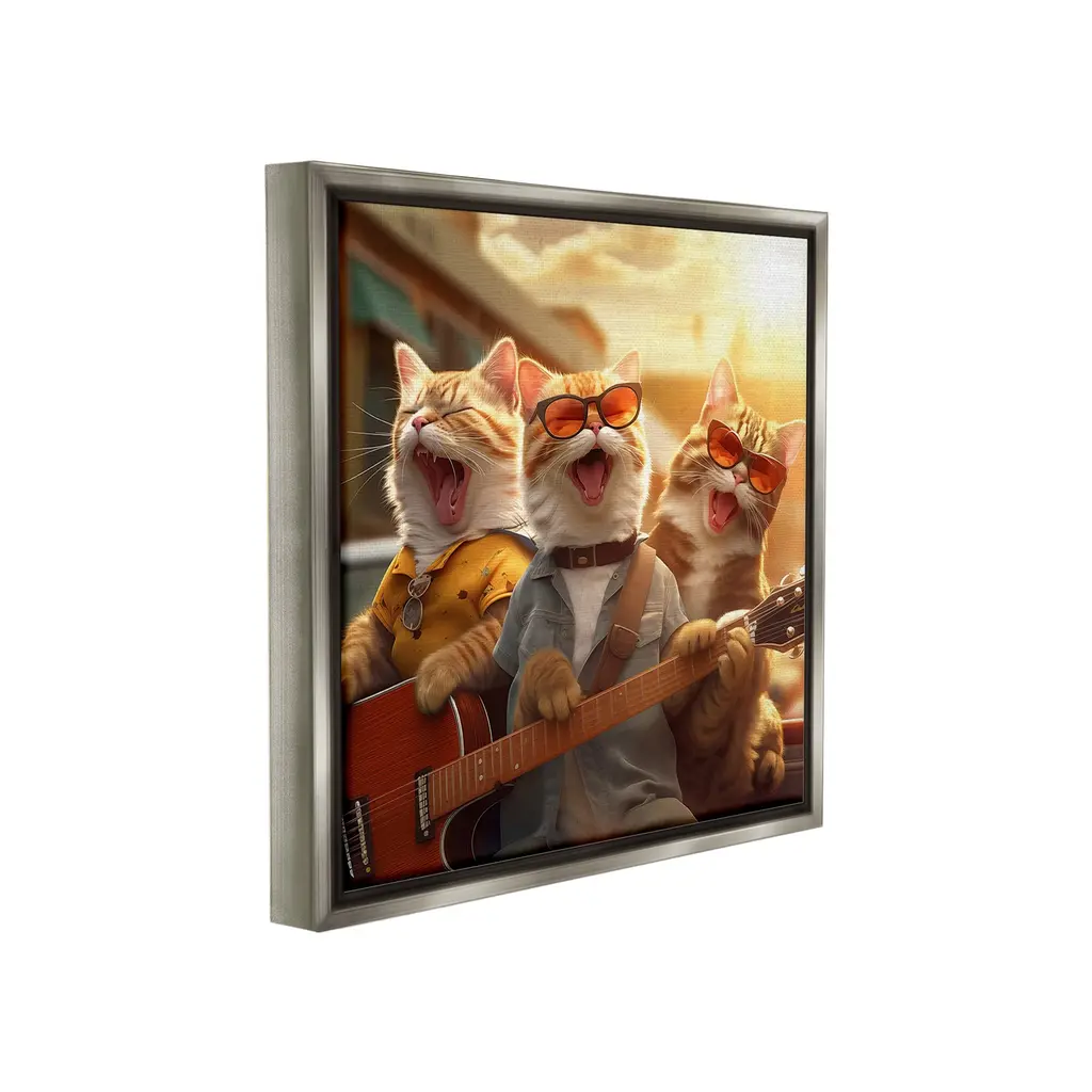 Elevate your home or office to the next level with Stupell Framed Floating Canvas Wall Art. Our premium hand-stretched canvas is mounted securely into a sturdy lightweight frame. The museum-style gap between the wrapped canvas and the box frame gives the illusion of floating artwork. Stupell Wall Art is made in the USA.Features: Dimensions: 18 x 1.7 x 18 Frame, 17 x 1.5 x 17 Canvas ArtFloating Frame Canvas Products are available in sizes 18"x18" and 25"x25". All Floating Frame Canvas Products have a 1.7" Depth.Wall Art is Ready to Hang with Hardware Free Hanging. No Installation required. For Easy Set Up Lean or Layer Artwork on Shelf or Against Wall. Artwork is Permently Fixed into the Frame.Our elevated 1.7" Thick Floating Frame is the perfect complement to our canvas style Wall Art. We use only the highest quality inks in house with industry leading printing solutions. Canvas is hand stretched over a durable wood foundation and then mounted securly into a Modern Box Frame. Made in the USA.Artwork Relates To: Animal, Cat, Mammal, Pet, Humor, Funny, Music, Musician, GuitarDesign by Jim Baldwin