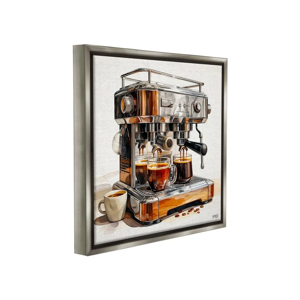 Elevate your home or office to the next level with Stupell Framed Floating Canvas Wall Art. Our premium hand-stretched canvas is mounted securely into a sturdy lightweight frame. The museum-style gap between the wrapped canvas and the box frame gives the illusion of floating artwork. Stupell Wall Art is made in the USA.Features: Dimensions: 18 x 1.7 x 18 Frame, 17 x 1.5 x 17 Canvas ArtFloating Frame Canvas Products are available in sizes 18"x18" and 25"x25". All Floating Frame Canvas Products have a 1.7" Depth.Wall Art is Ready to Hang with Hardware Free Hanging. No Installation required. For Easy Set Up Lean or Layer Artwork on Shelf or Against Wall. Artwork is Permently Fixed into the Frame.Our elevated 1.7" Thick Floating Frame is the perfect complement to our canvas style Wall Art. We use only the highest quality inks in house with industry leading printing solutions. Canvas is hand stretched over a durable wood foundation and then mounted securly into a Modern Box Frame. Made in the USA.Artwork Relates To: Cup, Beverage, Coffee, Coffee Cup, Espresso, Machine, Cafe, KitchenDesign by RB