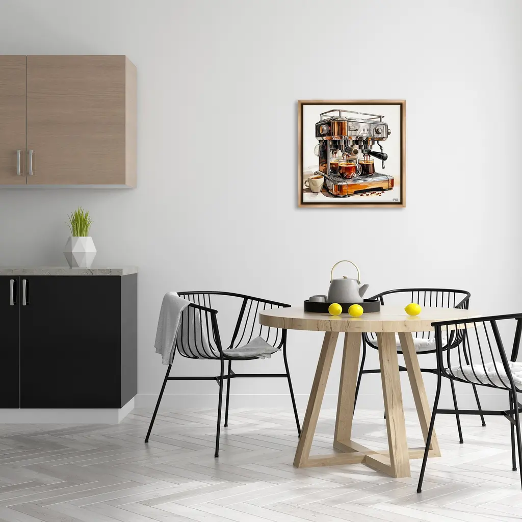 Elevate your home or office to the next level with Stupell Framed Floating Canvas Wall Art. Our premium hand-stretched canvas is mounted securely into a sturdy lightweight frame. The museum-style gap between the wrapped canvas and the box frame gives the illusion of floating artwork. Stupell Wall Art is made in the USA.Features: Dimensions: 18 x 1.7 x 18 Frame, 17 x 1.5 x 17 Canvas ArtFloating Frame Canvas Products are available in sizes 18"x18" and 25"x25". All Floating Frame Canvas Products have a 1.7" Depth.Wall Art is Ready to Hang with Hardware Free Hanging. No Installation required. For Easy Set Up Lean or Layer Artwork on Shelf or Against Wall. Artwork is Permently Fixed into the Frame.Our elevated 1.7" Thick Floating Frame is the perfect complement to our canvas style Wall Art. We use only the highest quality inks in house with industry leading printing solutions. Canvas is hand stretched over a durable wood foundation and then mounted securly into a Modern Box Frame. Made in the USA.Artwork Relates To: Cup, Beverage, Coffee, Coffee Cup, Espresso, Machine, Cafe, KitchenDesign by RB
