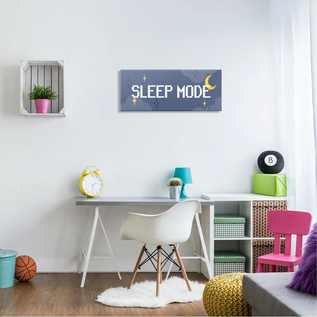 We create our stretched canvas to the highest standards. Using only the highest quality inks and canvas on Mimaki printers, we hand-cut and stretch each piece over a 1.5-inch thick wooden frame for hanging. As a result, the art comes ready to hang on the sturdy ledge with no installation required. Stupell Wall Art is made in the USA.Features: Dimensions: 24 x 1.5 x 10 InchesStretched Canvas Sizes Include Standard: 24 x 1.5 x 10 Large: 30 x 1.5 x 13 X-Large: 40 x 1.5 x 17 Oversized: 48 x 1.5 x 20Wall Art is Ready to Hang with Hardware Free Hanging. No installation required. For Easy Set Up Lean or Layer Artwork on Shelf or Against Wall.Our stretched canvas is created with the highest standards. We use only the highest quality inks and canvas on our in house Mimaki printers, and then hand cut and stretch each piece over a 1.5 inch thick wooden frame for hanging. Made In USA.Artwork Relates To: Gaming, Video Game, Gamer, Controller, Moon, Stars, Pixel, Sleep ModeDesign by Lil' Rue