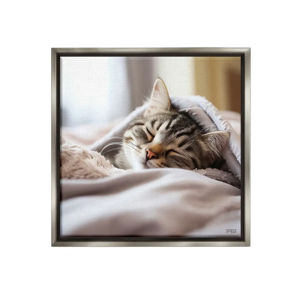 Elevate your home or office to the next level with Stupell Framed Floating Canvas Wall Art. Our premium hand-stretched canvas is mounted securely into a sturdy lightweight frame. The museum-style gap between the wrapped canvas and the box frame gives the illusion of floating artwork. Stupell Wall Art is made in the USA.Features: Dimensions: 18 x 1.7 x 18 Frame, 17 x 1.5 x 17 Canvas ArtFloating Frame Canvas Products are available in sizes 18"x18" and 25"x25". All Floating Frame Canvas Products have a 1.7" Depth.Wall Art is Ready to Hang with Hardware Free Hanging. No Installation required. For Easy Set Up Lean or Layer Artwork on Shelf or Against Wall. Artwork is Permently Fixed into the Frame.Our elevated 1.7" Thick Floating Frame is the perfect complement to our canvas style Wall Art. We use only the highest quality inks in house with industry leading printing solutions. Canvas is hand stretched over a durable wood foundation and then mounted securly into a Modern Box Frame. Made in the USA.Artwork Relates To: Animal, Cat, Kitten, Mammal, Pet, Blanket, Person, Sleeping, BlanketDesign by RB