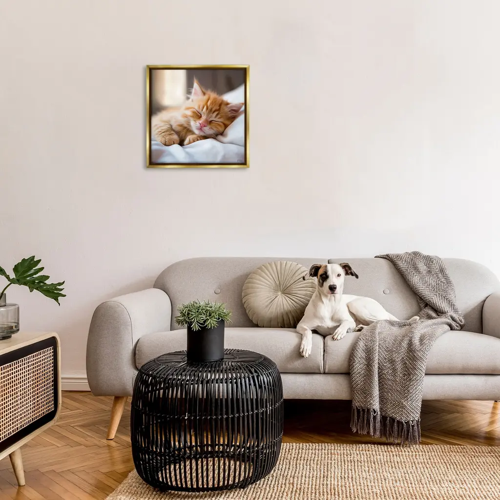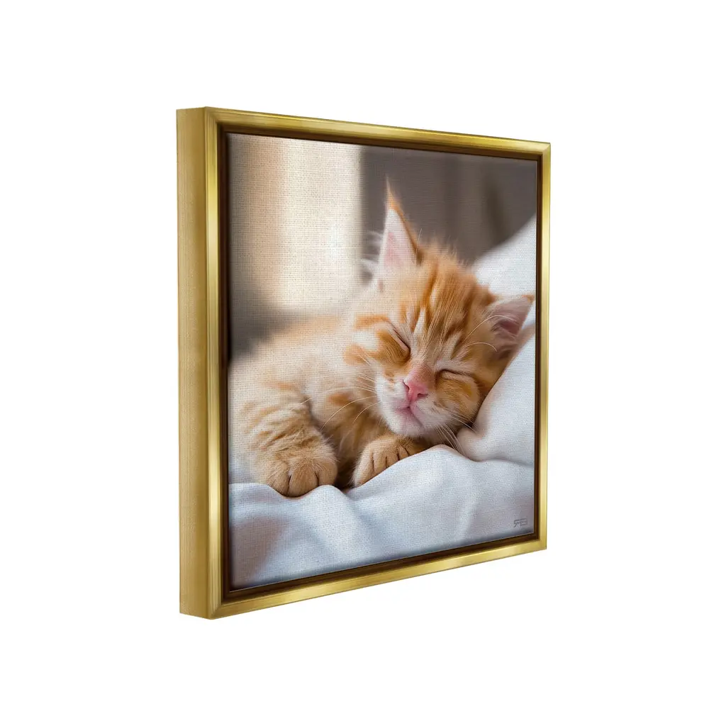 Elevate your home or office to the next level with Stupell Framed Floating Canvas Wall Art. Our premium hand-stretched canvas is mounted securely into a sturdy lightweight frame. The museum-style gap between the wrapped canvas and the box frame gives the illusion of floating artwork. Stupell Wall Art is made in the USA.Features: Dimensions: 18 x 1.7 x 18 Frame, 17 x 1.5 x 17 Canvas ArtFloating Frame Canvas Products are available in sizes 18"x18" and 25"x25". All Floating Frame Canvas Products have a 1.7" Depth.Wall Art is Ready to Hang with Hardware Free Hanging. No Installation required. For Easy Set Up Lean or Layer Artwork on Shelf or Against Wall. Artwork is Permently Fixed into the Frame.Our elevated 1.7" Thick Floating Frame is the perfect complement to our canvas style Wall Art. We use only the highest quality inks in house with industry leading printing solutions. Canvas is hand stretched over a durable wood foundation and then mounted securly into a Modern Box Frame. Made in the USA.Artwork Relates To: Animal, Cat, Kitten, Mammal, Pet, Blanket, Person, Sleeping, BlanketDesign by RB