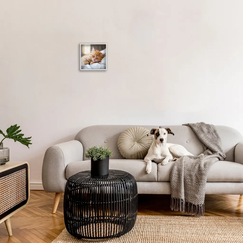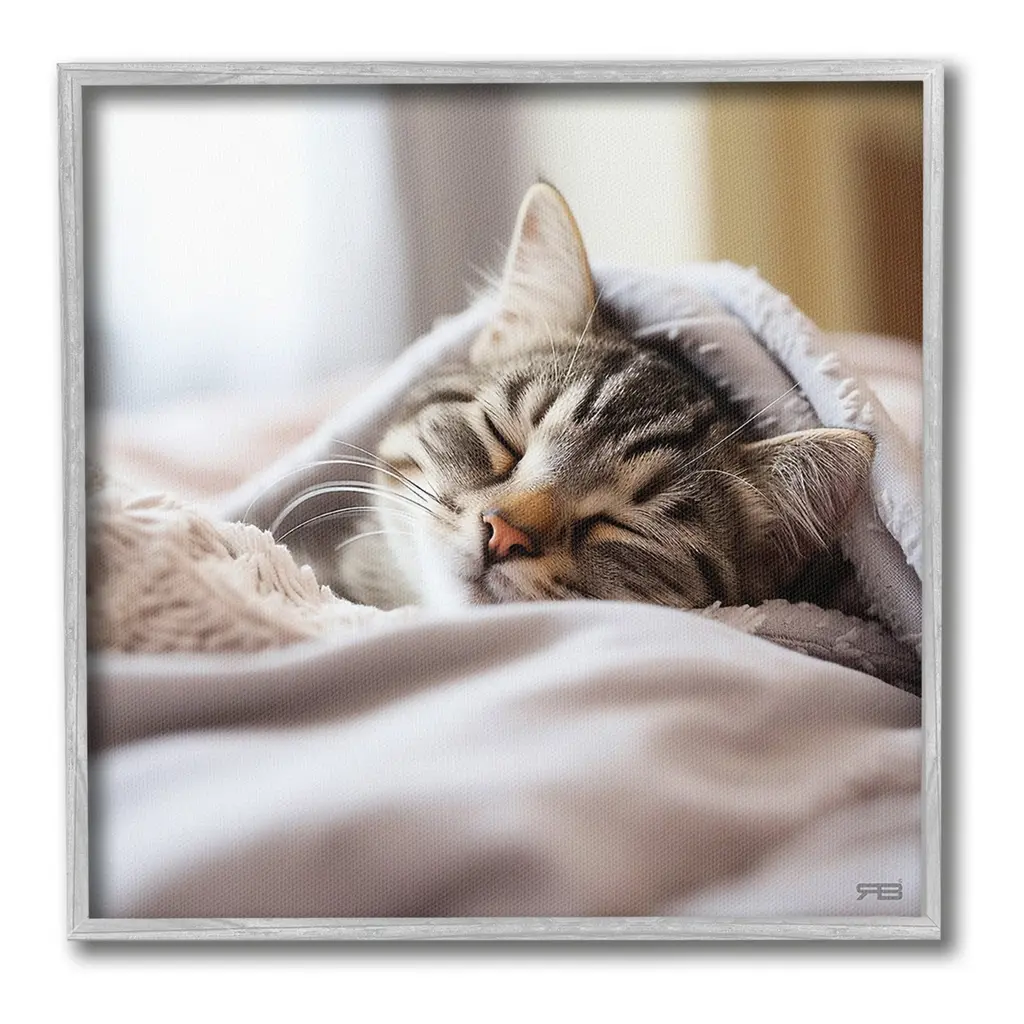 Add dimension to any room with our textured Framed Giclee Artwork. Our framed artwork is securely mounted into a 1.5-inch thick wood grain frame and ready to hang. Frames are available in three alluring styles: black, gray farmhouse and white. In addition, you should check out our oversized options if you want a statement piece. Stupell Wall Art is made in the USA.Features: Dimensions: 12 x 1.5 x 12 FramedFramed Giclee Product Sizes Include 12"x12", 17"x17", and 24"x24". Framed Giclee Products have a 1.5" Depth. Wall Art is Ready to Hang with Hardware Free Hanging. No installation required. For Easy Set Up Lean or Layer Artwork on Shelf or Against Wall.Our giclée prints are carefully mounted on a durable MDF backing, and then perfectly finished in a 1.5 inch thick woodgrain frame. Mounted frame colors include black, gray farmhouse and white. Made In USA.Artwork Relates To: Animal, Cat, Kitten, Mammal, Pet, Blanket, Person, Sleeping, BlanketDesign by RB
