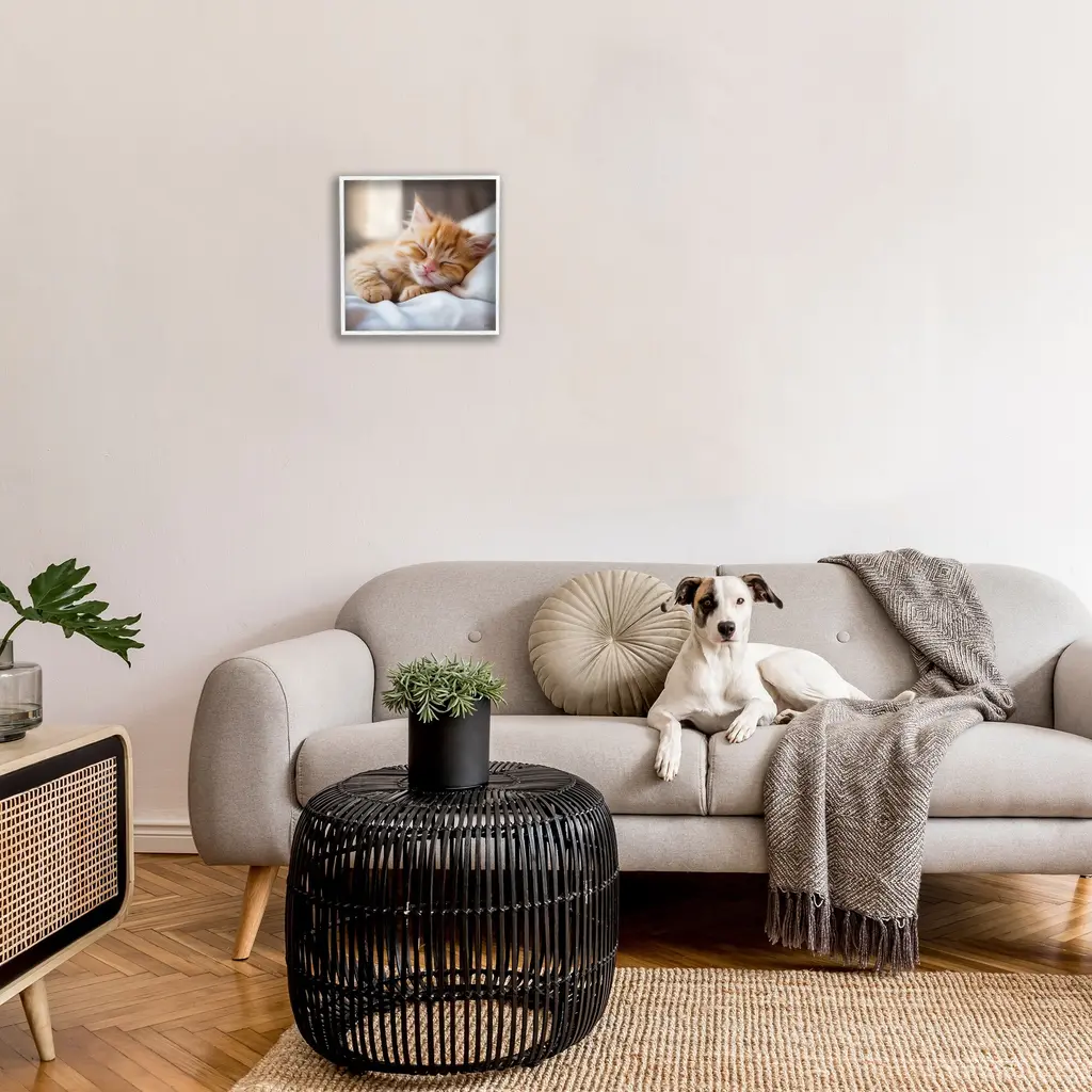 Add dimension to any room with our textured Framed Giclee Artwork. Our framed artwork is securely mounted into a 1.5-inch thick wood grain frame and ready to hang. Frames are available in three alluring styles: black, gray farmhouse and white. In addition, you should check out our oversized options if you want a statement piece. Stupell Wall Art is made in the USA.Features: Dimensions: 12 x 1.5 x 12 FramedFramed Giclee Product Sizes Include 12"x12", 17"x17", and 24"x24". Framed Giclee Products have a 1.5" Depth. Wall Art is Ready to Hang with Hardware Free Hanging. No installation required. For Easy Set Up Lean or Layer Artwork on Shelf or Against Wall.Our giclée prints are carefully mounted on a durable MDF backing, and then perfectly finished in a 1.5 inch thick woodgrain frame. Mounted frame colors include black, gray farmhouse and white. Made In USA.Artwork Relates To: Animal, Cat, Kitten, Mammal, Pet, Blanket, Person, Sleeping, BlanketDesign by RB