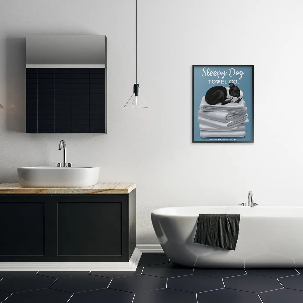 Stupell Sleepy Dog Towel Co. Adorable Boston Terrier Bathroom Framed Wall Art - 24 X 30 - Black