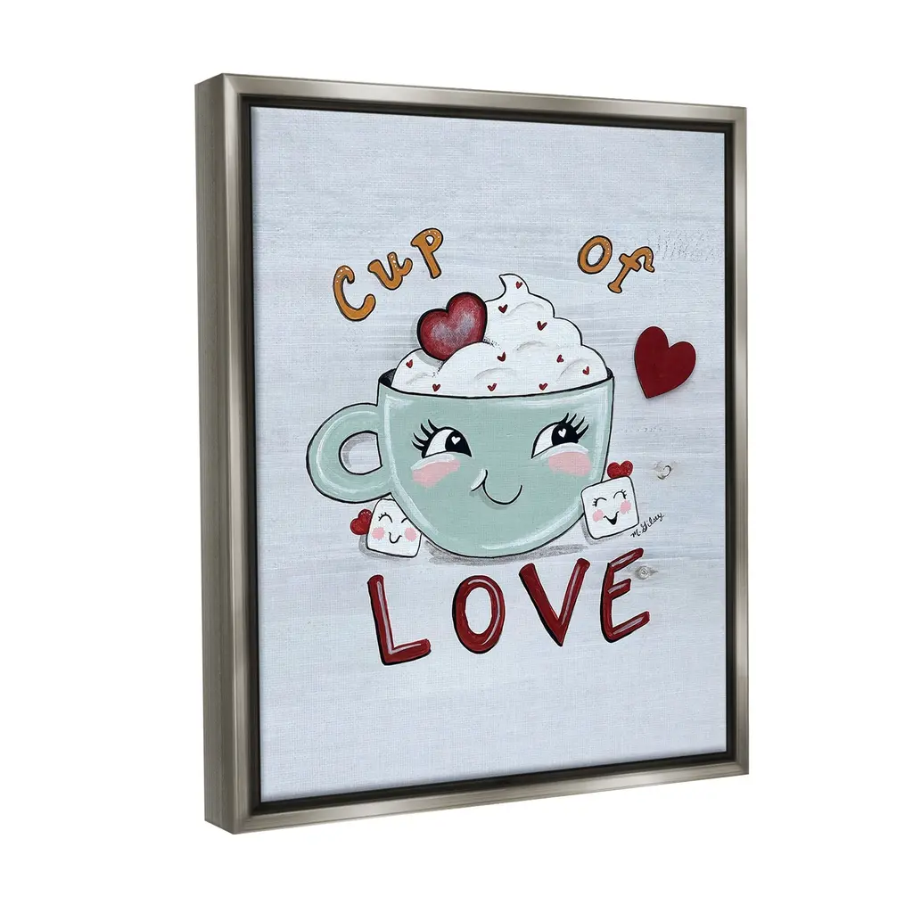 Elevate your home or office to the next level with Stupell Framed Floating Canvas Wall Art. Our premium hand-stretched canvas is mounted securely into a sturdy lightweight frame. The museum-style gap between the wrapped canvas and the box frame gives the illusion of floating artwork. Stupell Wall Art is made in the USA.Features: Dimensions: 17 x 1.7 x 21 Frame, 16 x 1.5 x 20 Canvas ArtFloating Frame Canvas Products are available in sizes 17"x21" and 25"x31". All Floating Frame Canvas Products have a 1.7" Depth.Wall Art is Ready to Hang with Hardware Free Hanging. No Installation required. For Easy Set Up Lean or Layer Artwork on Shelf or Against Wall. Artwork is Permently Fixed into the Frame.Our elevated 1.7" Thick Floating Frame is the perfect complement to our canvas style Wall Art. We use only the highest quality inks in house with industry leading printing solutions. Canvas is hand stretched over a durable wood foundation and then mounted securly into a Modern Box Frame. Made in the USA.Artwork Relates To: Dessert, Food, Beverage, Coffee, Mug, Cocoa, Whipped Cream, Heart, Cup Of LoveDesign by Michelle Gilsey
