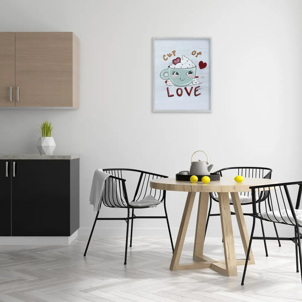 Add dimension to any room with our textured Framed Giclee Artwork. Our framed artwork is securely mounted into a 1.5-inch thick wood grain frame and ready to hang. Frames are available in three alluring styles: black, gray farmhouse and white. In addition, you should check out our oversized options if you want a statement piece. Stupell Wall Art is made in the USA.Features: Dimensions: 11 x 1.5 x 14 FramedFramed Giclee Products are available in the sizes 11"x14", 16"x20" or 24"x30". All Framed Giclee Products have a 1.5" Depth. Wall Art is Ready to Hang with Hardware Free Hanging. No installation required. For Easy Set Up Lean or Layer Artwork on Shelf or Against Wall.Our giclée prints are carefully mounted on a durable MDF backing, and then perfectly finished in a 1.5 inch thick woodgrain frame. Mounted frame colors include black, gray farmhouse and white. Made In USA.Artwork Relates To: Dessert, Food, Beverage, Coffee, Mug, Cocoa, Whipped Cream, Heart, Cup Of LoveDesign by Michelle Gilsey