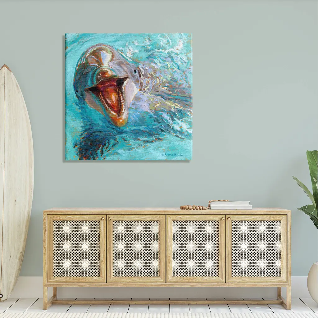 Proudly made in the USA, Our stretched canvas is created with the highest standards. We use only the highest quality inks and canvas on our in house Mimaki printers, and then hand cut and stretch each piece over a 1.5 inch thick wooden frame for hanging. The art comes ready to hang with no installation required.Features: Dimensions: 17 x 1.5 x 17 InchesStretched Canvas Sizes Include Standard: 17 x 1.5 x 17 Large: 24 x 1.5 x 24 X-Large: 30 x 1.5 x 30 Oversized: 36 x 1.5 x 36Wall Art is Ready to Hang - No Installation or Hardware Needed. For Easy Set Up Lean or Layer Artwork on Shelf or Against Wall.Our stretched canvas is created with the highest standards. We use only the highest quality inks and canvas on our in house Mimaki printers, and then hand cut and stretch each piece over a 1.5 inch thick wooden frame for hanging. Made In USA.Artwork Relates To: Dolphin, Sea Life, Mammal, Animal, Painting, Aquatic, WaterDesign by Rita Kirkman