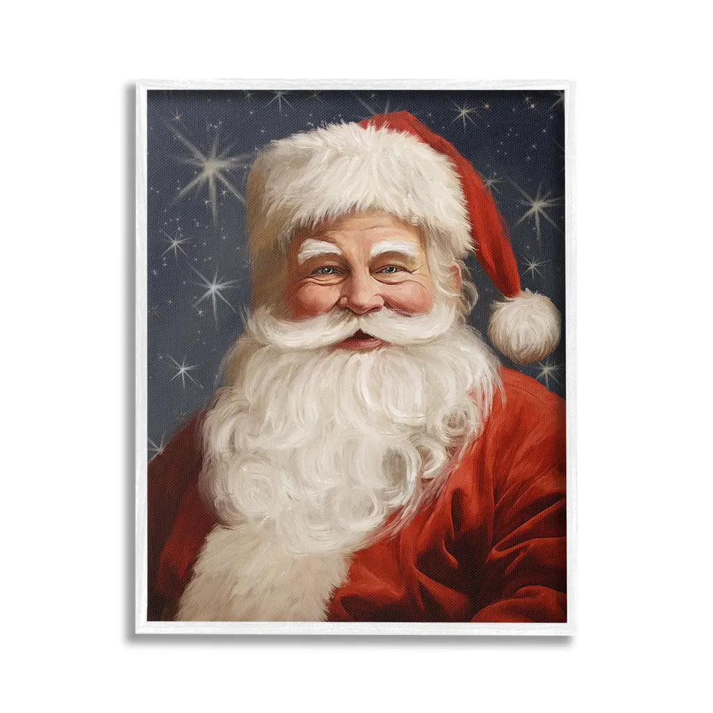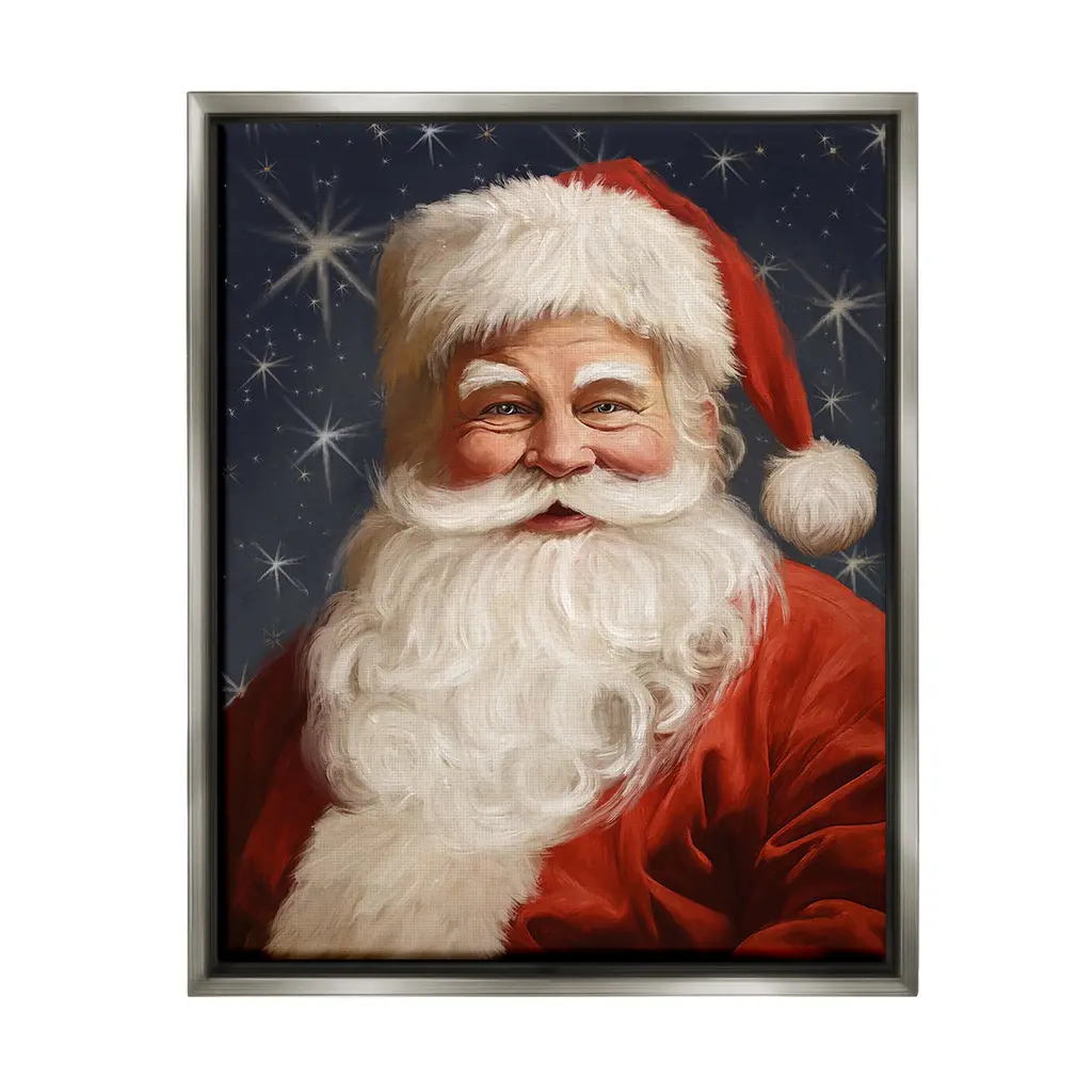 Elevate your home or office to the next level with Stupell Framed Floating Canvas Wall Art. Our premium hand-stretched canvas is mounted securely into a sturdy lightweight frame. The museum-style gap between the wrapped canvas and the box frame gives the illusion of floating artwork. Stupell Wall Art is made in the USA.Features: Dimensions: 17 x 1.7 x 21 Frame, 16 x 1.5 x 20 Canvas ArtFloating Frame Canvas Products are available in sizes 17"x21" and 25"x31". All Floating Frame Canvas Products have a 1.7" Depth.Wall Art is Ready to Hang with Hardware Free Hanging. No Installation required. For Easy Set Up Lean or Layer Artwork on Shelf or Against Wall. Artwork is Permently Fixed into the Frame.Our elevated 1.7" Thick Floating Frame is the perfect complement to our canvas style Wall Art. We use only the highest quality inks in house with industry leading printing solutions. Canvas is hand stretched over a durable wood foundation and then mounted securly into a Modern Box Frame. Made in the USA.Artwork Relates To: Christmas, Santa Claus, Person, Gift, Present, Holiday, Winter, Snow, Snowflake, Star, PatternDesign by Ramona Murdock