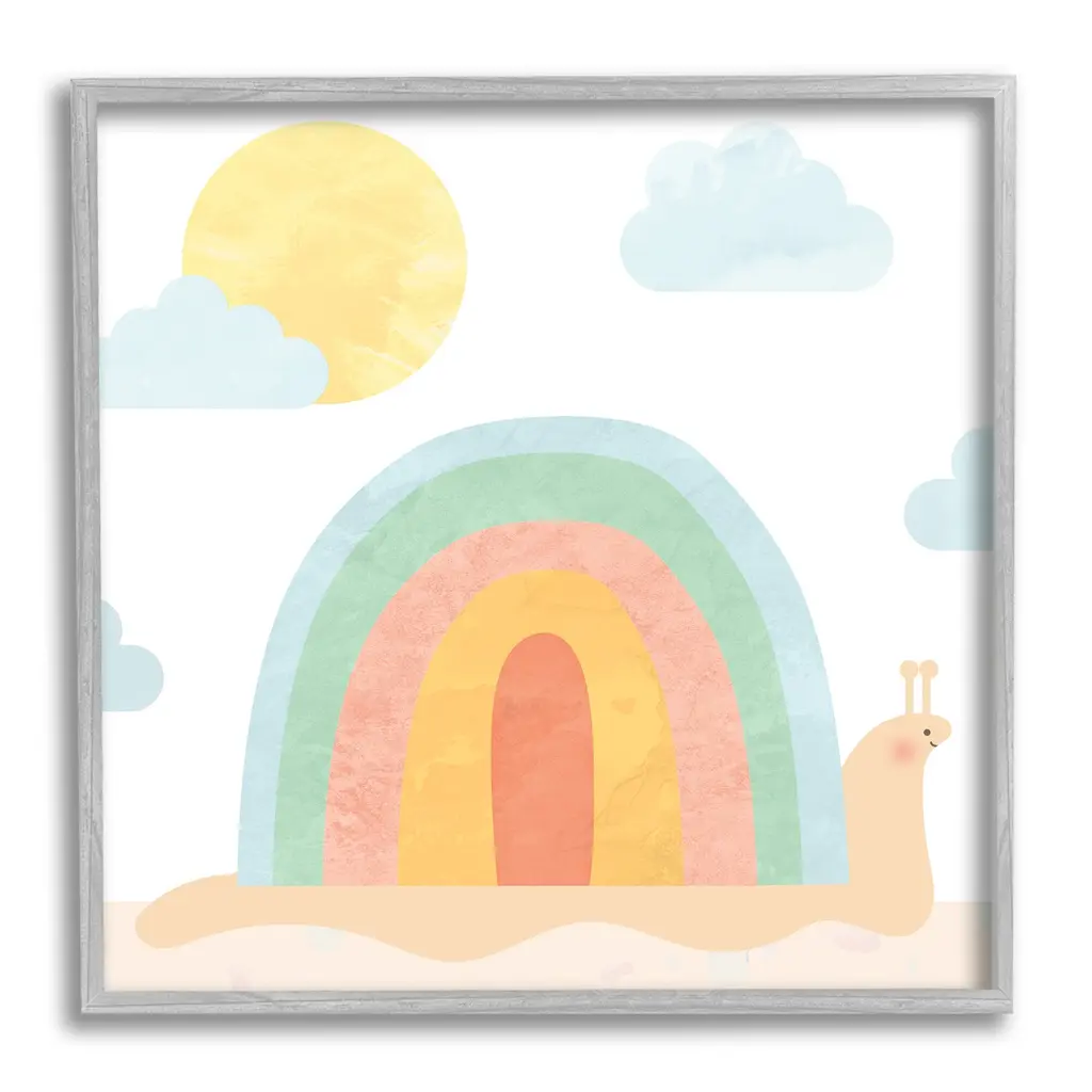 Add dimension to any room with our textured Framed Giclee Artwork. Our framed artwork is securely mounted into a 1.5-inch thick wood grain frame and ready to hang. Frames are available in three alluring styles: black, gray farmhouse and white. In addition, you should check out our oversized options if you want a statement piece. Stupell Wall Art is made in the USA.Features: Dimensions: 12 x 1.5 x 12 FramedFramed Giclee Sizes Include Standard: 12 x 1.5 x 12 Large: 17 x 1.5 x 17 Oversized: 24 x 1.5 x 24Wall Art is Ready to Hang - No Installation or Hardware Needed. For Easy Set Up Lean or Layer Artwork on Shelf or Against Wall.Our giclée prints are carefully mounted on a durable MDF backing, and then perfectly finished in a 1.5 inch thick woodgrain frame. Mounted frame colors include black, gray farmhouse and white. Made In USA.Artwork Relates To: Animal, Nature, Rainbow, Sky, Arch, Snail, Clouds, SunDesign by Lil' Rue