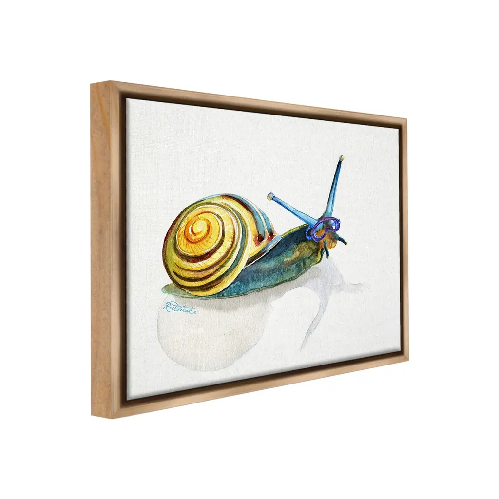 Elevate your home or office to the next level with Stupell Framed Floating Canvas Wall Art. Our premium hand-stretched canvas is mounted securely into a sturdy lightweight frame. The museum-style gap between the wrapped canvas and the box frame gives the illusion of floating artwork. Stupell Wall Art is made in the USA.Features: Dimensions: 21 x 1.7 x 17 Frame, 20 x 1.5 x 16 Canvas ArtFloating Frame Canvas Products are available in sizes 21"x17" and 31"x25". All Floating Frame Canvas Products have a 1.7" Depth.Wall Art is Ready to Hang with Hardware Free Hanging. No Installation required. For Easy Set Up Lean or Layer Artwork on Shelf or Against Wall. Artwork is Permently Fixed into the Frame.Our elevated 1.7" Thick Floating Frame is the perfect complement to our canvas style Wall Art. We use only the highest quality inks in house with industry leading printing solutions. Canvas is hand stretched over a durable wood foundation and then mounted securly into a Modern Box Frame. Made in the USA.Artwork Relates To: Animal, Invertebrate, Snail, Goggles, Swimming, Minimal, SnorkelingDesign by Jennifer Redstreake