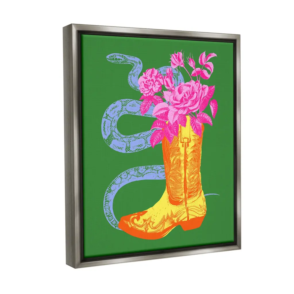 Elevate your home or office to the next level with Stupell Framed Floating Canvas Wall Art. Our premium hand-stretched canvas is mounted securely into a sturdy lightweight frame. The museum-style gap between the wrapped canvas and the box frame gives the illusion of floating artwork. Stupell Wall Art is made in the USA.Features: Dimensions: 17 x 1.7 x 21 Frame, 16 x 1.5 x 20 Canvas ArtFloating Frame Canvas Products are available in sizes 17"x21" and 25"x31". All Floating Frame Canvas Products have a 1.7" Depth.Wall Art is Ready to Hang with Hardware Free Hanging. No Installation required. For Easy Set Up Lean or Layer Artwork on Shelf or Against Wall. Artwork is Permently Fixed into the Frame.Our elevated 1.7" Thick Floating Frame is the perfect complement to our canvas style Wall Art. We use only the highest quality inks in house with industry leading printing solutions. Canvas is hand stretched over a durable wood foundation and then mounted securly into a Modern Box Frame. Made in the USA.Artwork Relates To: Floral, Pattern, Flower, Plant, Cowboy Boot, Animal, Reptile, Snake, Bouquet, Sunflower, Abstract, ModernDesign by Victoria Barnes