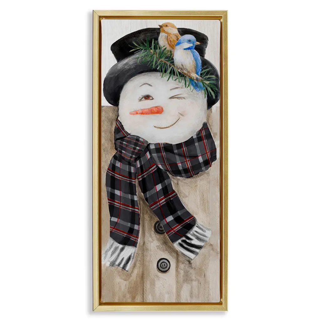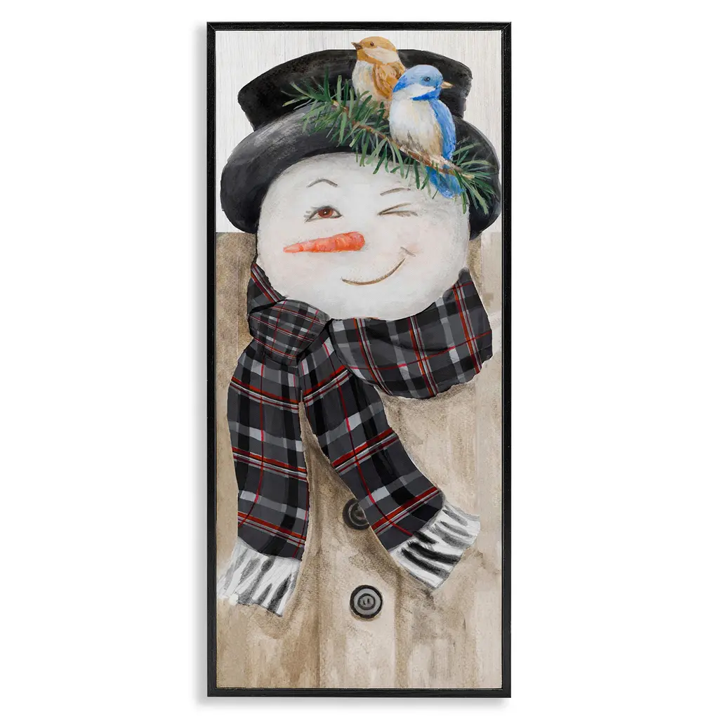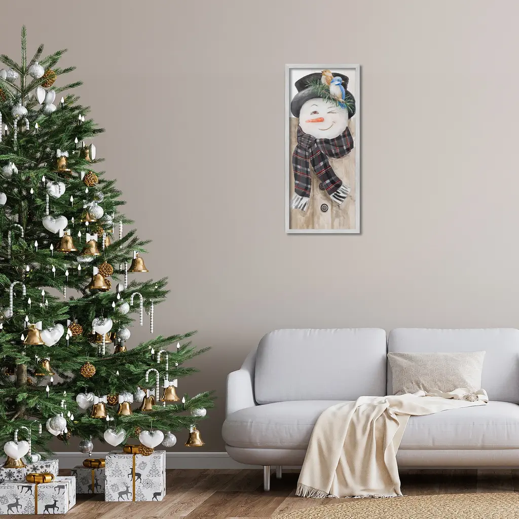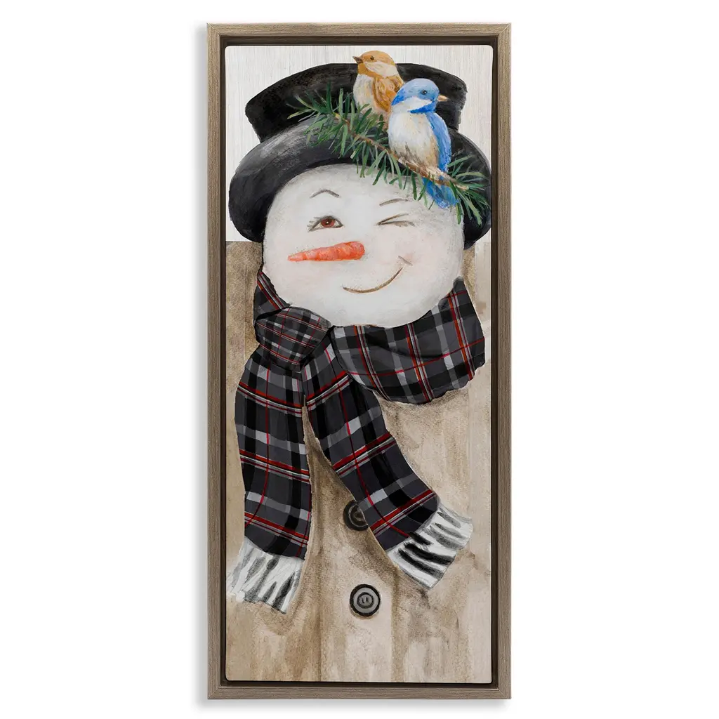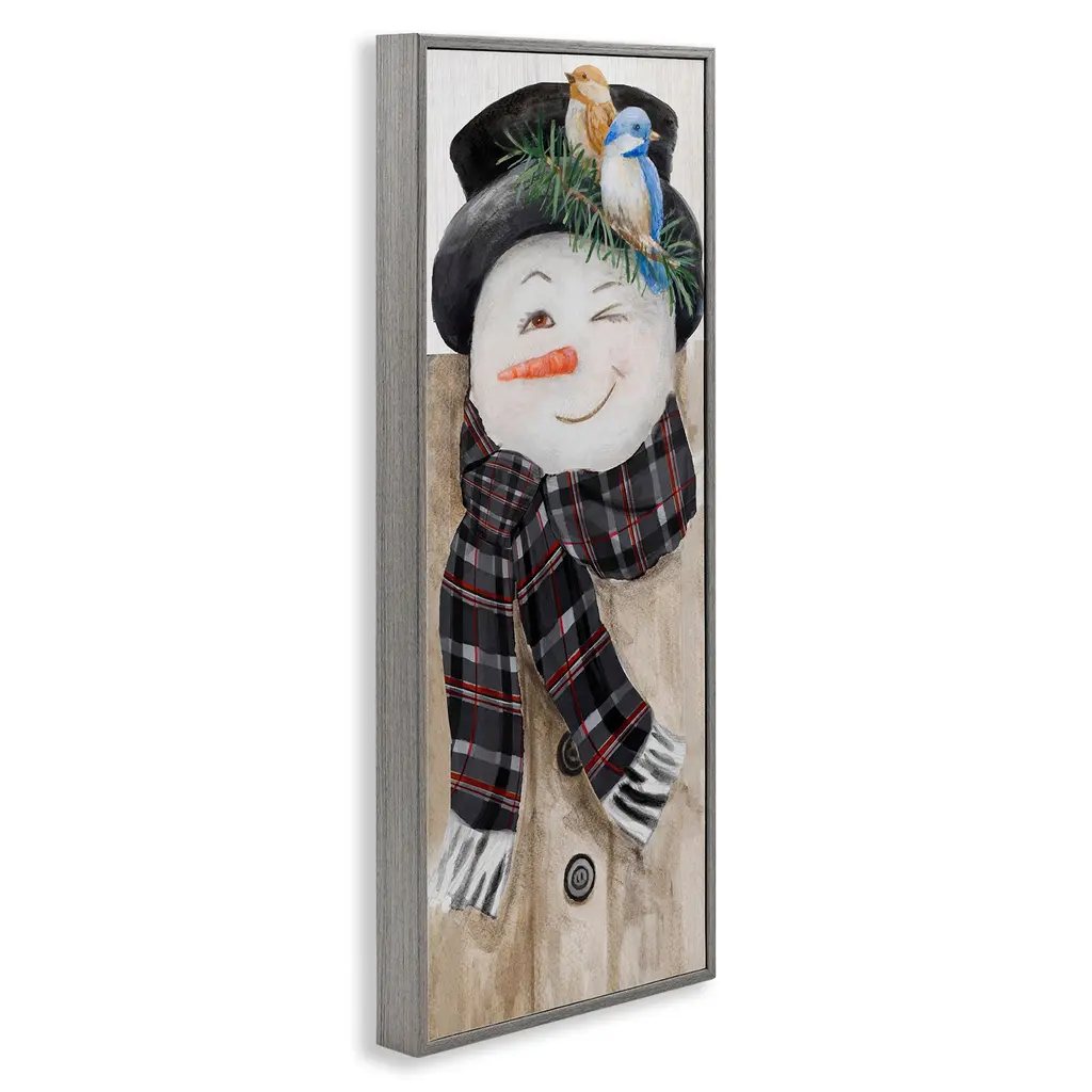 Stupell Snowman Wink Winter Birds Rustic Plaid Scarf Framed Wall Art - Multi-Color - 13 X 30 - Grey
