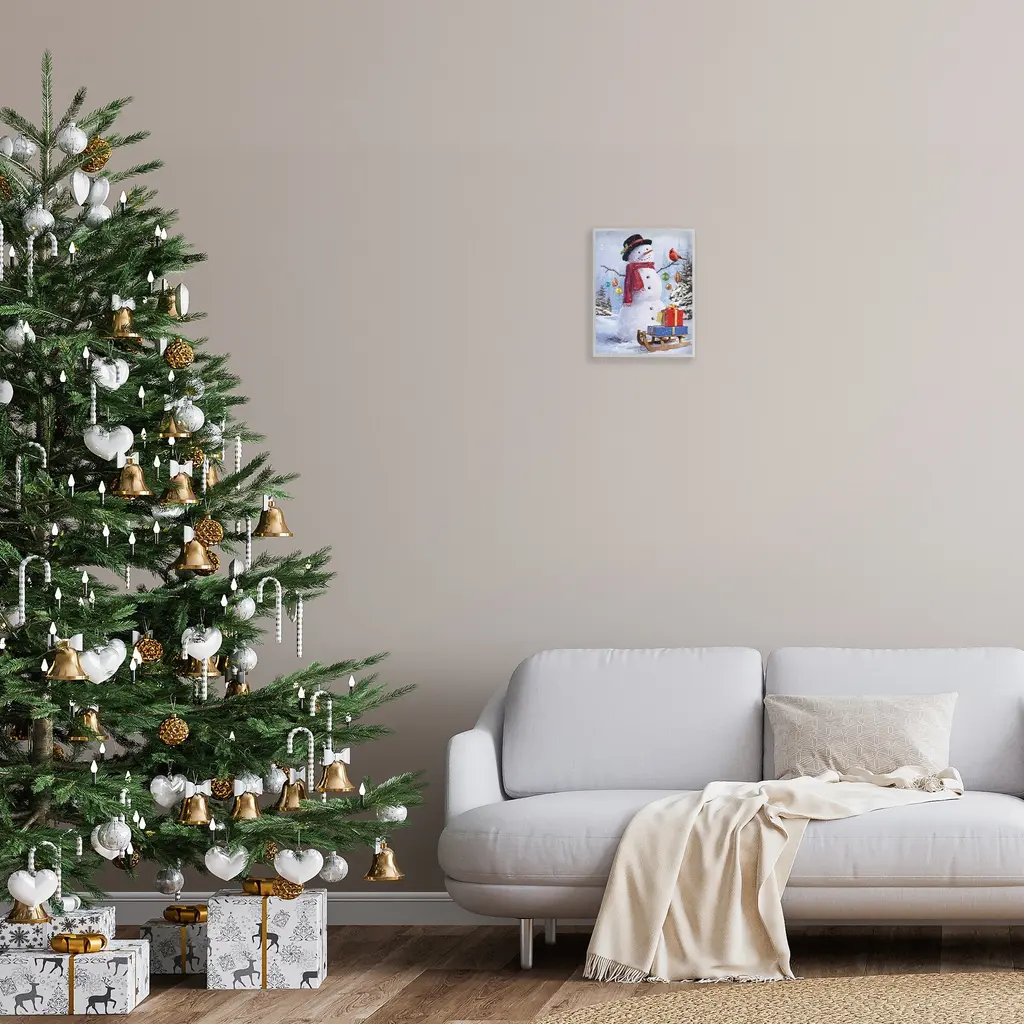 Stupell Snowman With Gift Sled Framed Giclee Art Design By Jason Kirk - 11 X 14 - Grey