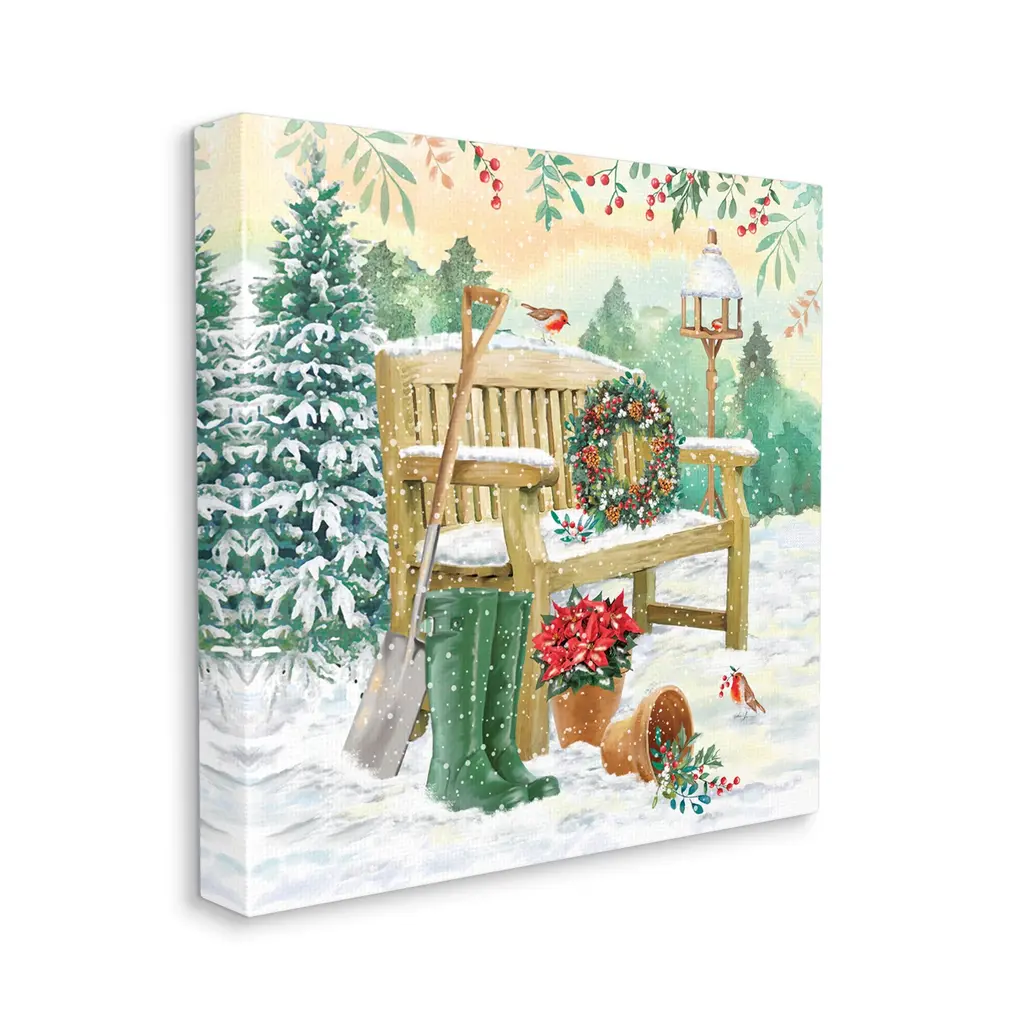 We create our stretched canvas to the highest standards. Using only the highest quality inks and canvas on Mimaki printers, we hand-cut and stretch each piece over a 1.5-inch thick wooden frame for hanging. As a result, the art comes ready to hang on the sturdy ledge with no installation required. Stupell Wall Art is made in the USA.Features: Dimensions: 17 x 1.5 x 17 InchesStretched Canvas Sizes Include Standard: 17 x 1.5 x 17 Large: 24 x 1.5 x 24 X-Large: 30 x 1.5 x 30 Oversized: 36 x 1.5 x 36Wall Art is Ready to Hang - No Installation or Hardware Needed. For Easy Set Up Lean or Layer Artwork on Shelf or Against Wall.Our stretched canvas is created with the highest standards. We use only the highest quality inks and canvas on our in house Mimaki printers, and then hand cut and stretch each piece over a 1.5 inch thick wooden frame for hanging. Made In USA.Artwork Relates To: Plant, Bench, Christmas, Tree, Nature, SnowDesign by Jane Sunner