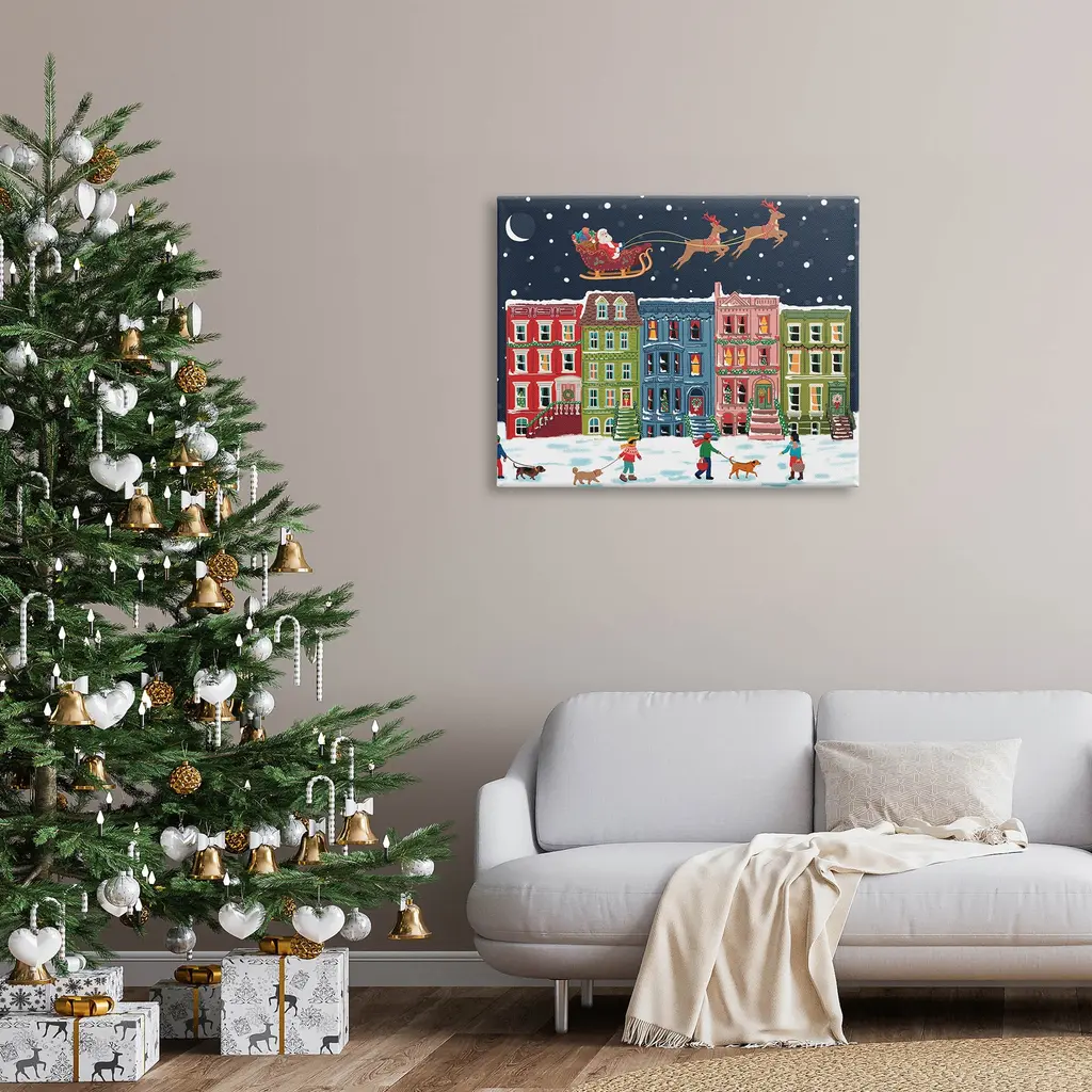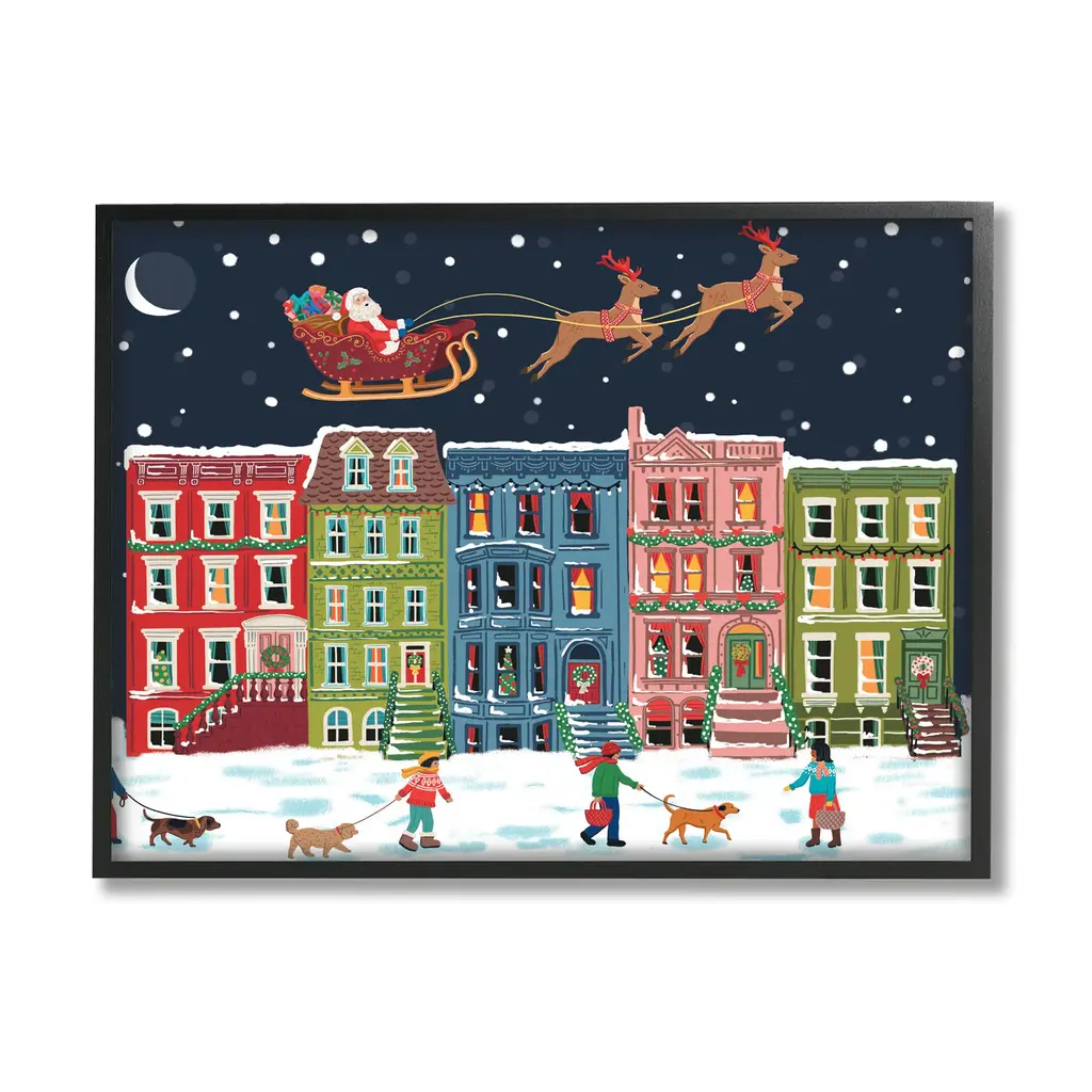 Proudly made in the USA, Our stretched canvas is created with the highest standards. We use only the highest quality inks and canvas on our in house Mimaki printers, and then hand cut and stretch each piece over a 1.5 inch thick wooden frame for hanging. The art comes ready to hang with no installation required.Features: Dimensions: 20 x 1.5 x 16 InchesStretched Canvas Sizes Include Standard: 20 x 1.5 x 16 Large: 30 x 1.5 x 20 X-Large: 40 x 1.5 x 30 Oversized: 48 x 1.5 x 36Wall Art is Ready to Hang - No Installation or Hardware Needed. For Easy Set Up Lean or Layer Artwork on Shelf or Against Wall.Our stretched canvas is created with the highest standards. We use only the highest quality inks and canvas on our in house Mimaki printers, and then hand cut and stretch each piece over a 1.5 inch thick wooden frame for hanging. Made In USA.Artwork Relates To: Neighborhood, Person, Dog, Canine, Pet, Animal, Mammal, Outdoors, Christmas, Santa Claus, Sleigh, Reindeer, TownDesign by Nancy McKenzie