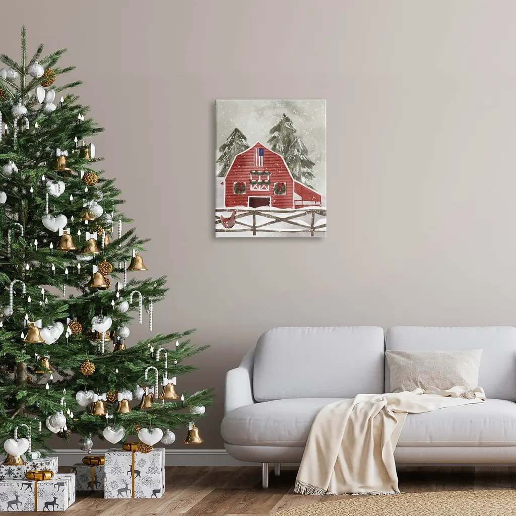 Proudly made in the USA, Our stretched canvas is created with the highest standards. We use only the highest quality inks and canvas on our in house Mimaki printers, and then hand cut and stretch each piece over a 1.5 inch thick wooden frame for hanging. The art comes ready to hang with no installation required.Features: Dimensions: 16 x 1.5 x 20 InchesStretched Canvas Sizes Include Standard: 16 x 1.5 x 20 Large: 20 x 1.5 x 30 X-Large: 30 x 1.5 x 40 Oversized: 36 x 1.5 x 48Wall Art is Ready to Hang - No Installation or Hardware Needed. For Easy Set Up Lean or Layer Artwork on Shelf or Against Wall.Our stretched canvas is created with the highest standards. We use only the highest quality inks and canvas on our in house Mimaki printers, and then hand cut and stretch each piece over a 1.5 inch thick wooden frame for hanging. Made In USA.Artwork Relates To: Barn, Country, Farm, Christmas, Snow, Christmas Tree, Winter, AmericanaDesign by Laura Konyndyk