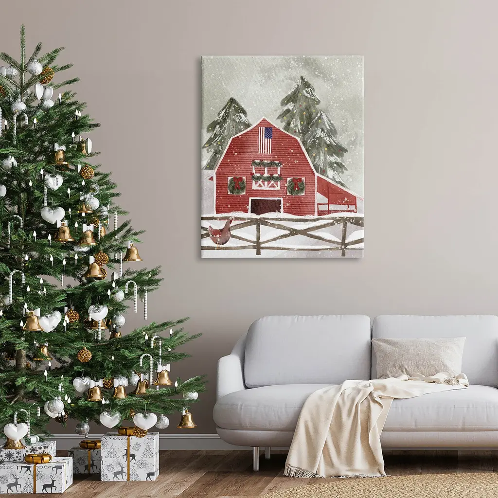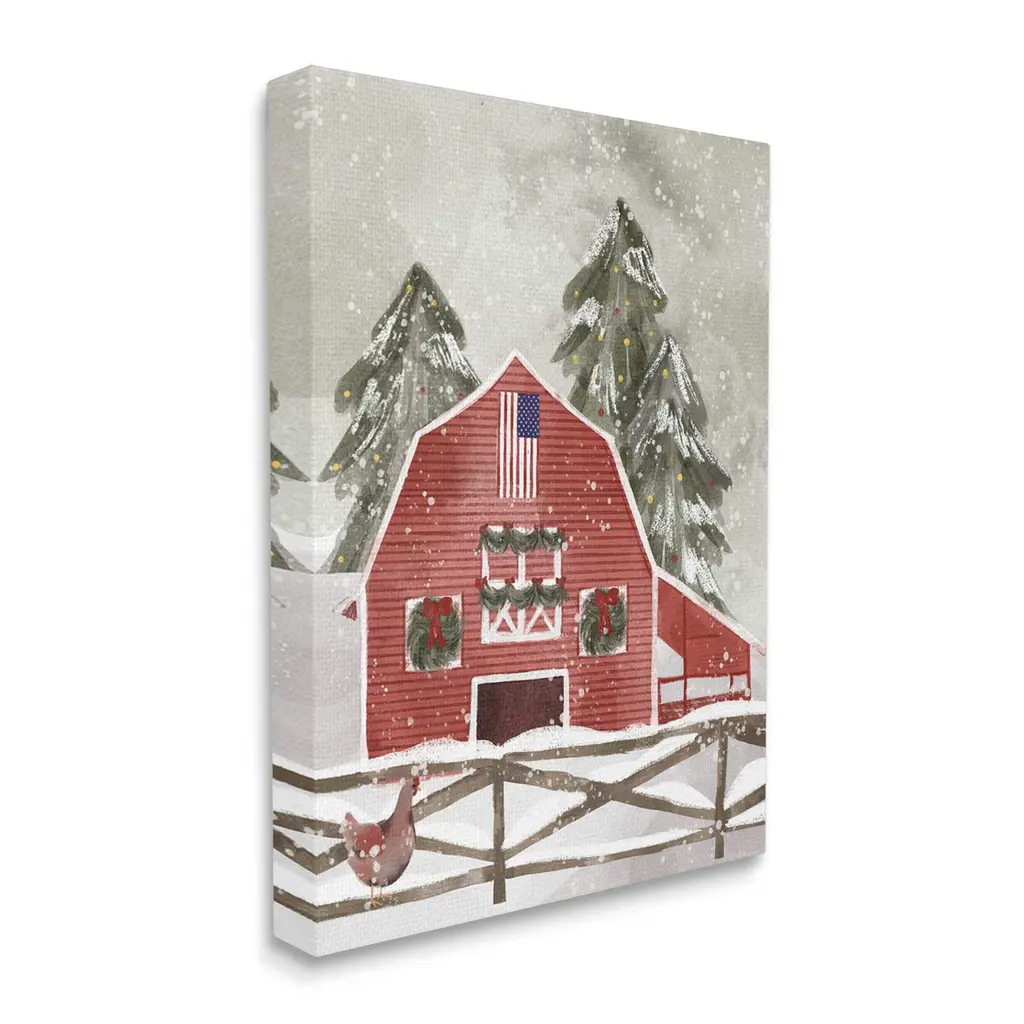 Proudly made in the USA, Our stretched canvas is created with the highest standards. We use only the highest quality inks and canvas on our in house Mimaki printers, and then hand cut and stretch each piece over a 1.5 inch thick wooden frame for hanging. The art comes ready to hang with no installation required.Features: Dimensions: 16 x 1.5 x 20 InchesStretched Canvas Sizes Include Standard: 16 x 1.5 x 20 Large: 20 x 1.5 x 30 X-Large: 30 x 1.5 x 40 Oversized: 36 x 1.5 x 48Wall Art is Ready to Hang - No Installation or Hardware Needed. For Easy Set Up Lean or Layer Artwork on Shelf or Against Wall.Our stretched canvas is created with the highest standards. We use only the highest quality inks and canvas on our in house Mimaki printers, and then hand cut and stretch each piece over a 1.5 inch thick wooden frame for hanging. Made In USA.Artwork Relates To: Barn, Country, Farm, Christmas, Snow, Christmas Tree, Winter, AmericanaDesign by Laura Konyndyk