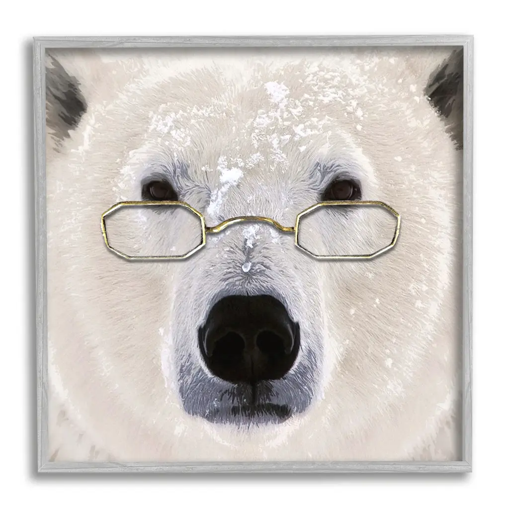 Our Framed Giclee Wall Art adds a touch of class to any space in your home or office. Frames are available in three alluring styles: black, gray farmhouse and white. Our textured artwork will add more depth and dimension to any space. Each piece is mounted with a 1.5 inch thick wood grain frame that is ready to hang! Looking for a statement piece? We have oversized artwork available. Room Type: Living Room, Den, Hallway, Office, Entryway, Study, Dining Room or Bedroom, Guest Room, Studio, Dorm or BoudoirFeatures: Dimensions: 12 x 1.5 x 12 FramedFramed Giclee Sizes Include Standard: 12 x 1.5 x 12 Large: 17 x 1.5 x 17 Oversized: 24 x 1.5 x 24Wall Art is Ready to Hang - No Installation or Hardware Needed. For Easy Set Up Lean or Layer Artwork on Shelf or Against Wall.Our giclée prints are carefully mounted on a durable MDF backing, and then perfectly finished in a 1.5 inch thick woodgrain frame. Mounted frame colors include black, gray farmhouse and white. Made In USA.Artwork Relates To: Animal, Mammal, Bear, Wildlife, Polar Bear, GlassesDesign by Karen Smith
