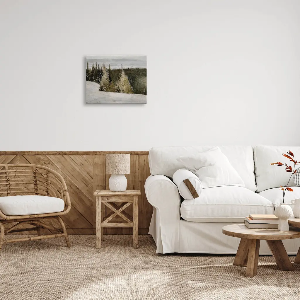 Proudly made in the USA, Our stretched canvas is created with the highest standards. We use only the highest quality inks and canvas on our in house Mimaki printers, and then hand cut and stretch each piece over a 1.5 inch thick wooden frame for hanging. The art comes ready to hang with no installation required.Features: Dimensions: 20 x 1.5 x 16 InchesStretched Canvas Sizes Include Standard: 20 x 1.5 x 16 Large: 30 x 1.5 x 20 X-Large: 40 x 1.5 x 30 Oversized: 48 x 1.5 x 36Wall Art is Ready to Hang - No Installation or Hardware Needed. For Easy Set Up Lean or Layer Artwork on Shelf or Against Wall.Our stretched canvas is created with the highest standards. We use only the highest quality inks and canvas on our in house Mimaki printers, and then hand cut and stretch each piece over a 1.5 inch thick wooden frame for hanging. Made In USA.Artwork Relates To: Tree, Painting, Conifer, Woodland, Outdoors, Land, Nature, Snow, Wilderness, Pine, GroveDesign by Lettered and Lined