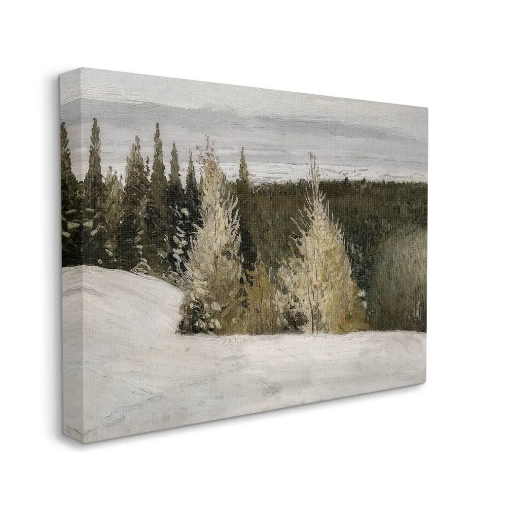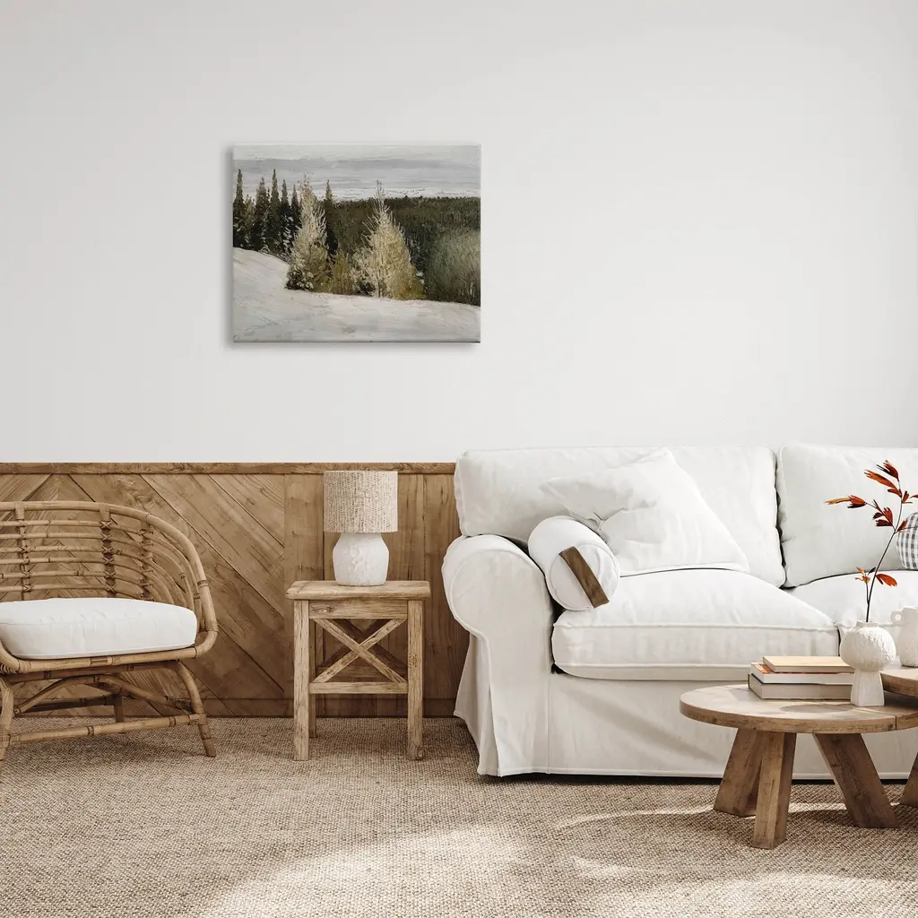 Proudly made in the USA, Our stretched canvas is created with the highest standards. We use only the highest quality inks and canvas on our in house Mimaki printers, and then hand cut and stretch each piece over a 1.5 inch thick wooden frame for hanging. The art comes ready to hang with no installation required.Features: Dimensions: 20 x 1.5 x 16 InchesStretched Canvas Sizes Include Standard: 20 x 1.5 x 16 Large: 30 x 1.5 x 20 X-Large: 40 x 1.5 x 30 Oversized: 48 x 1.5 x 36Wall Art is Ready to Hang - No Installation or Hardware Needed. For Easy Set Up Lean or Layer Artwork on Shelf or Against Wall.Our stretched canvas is created with the highest standards. We use only the highest quality inks and canvas on our in house Mimaki printers, and then hand cut and stretch each piece over a 1.5 inch thick wooden frame for hanging. Made In USA.Artwork Relates To: Tree, Painting, Conifer, Woodland, Outdoors, Land, Nature, Snow, Wilderness, Pine, GroveDesign by Lettered and Lined