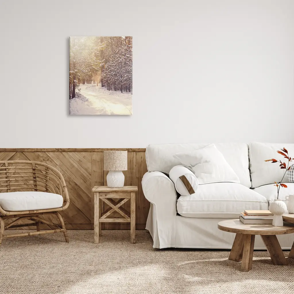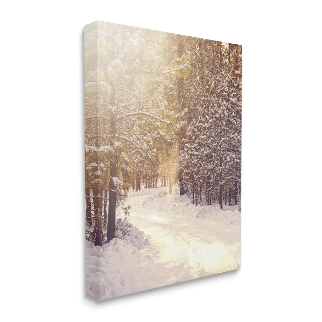 We create our stretched canvas to the highest standards. Using only the highest quality inks and canvas on Mimaki printers, we hand-cut and stretch each piece over a 1.5-inch thick wooden frame for hanging. As a result, the art comes ready to hang on the sturdy ledge with no installation required. Stupell Wall Art is made in the USA.Features: Dimensions: 16 x 1.5 x 20 InchesStretched Canvas Sizes Include Standard: 16 x 1.5 x 20 Large: 20 x 1.5 x 30 X-Large: 30 x 1.5 x 40 Oversized: 36 x 1.5 x 48Wall Art is Ready to Hang with Hardware Free Hanging. No installation required. For Easy Set Up Lean or Layer Artwork on Shelf or Against Wall.Our stretched canvas is created with the highest standards. We use only the highest quality inks and canvas on our in house Mimaki printers, and then hand cut and stretch each piece over a 1.5 inch thick wooden frame for hanging. Made In USA.Artwork Relates To: Tree, Woodland, Winter, Scenery, Snow, Path, SunlightDesign by Leah Straatsma