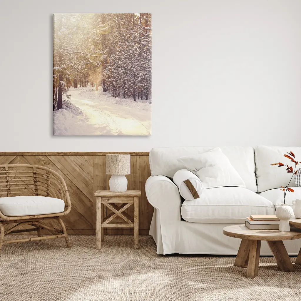 We create our stretched canvas to the highest standards. Using only the highest quality inks and canvas on Mimaki printers, we hand-cut and stretch each piece over a 1.5-inch thick wooden frame for hanging. As a result, the art comes ready to hang on the sturdy ledge with no installation required. Stupell Wall Art is made in the USA.Features: Dimensions: 16 x 1.5 x 20 InchesStretched Canvas Sizes Include Standard: 16 x 1.5 x 20 Large: 20 x 1.5 x 30 X-Large: 30 x 1.5 x 40 Oversized: 36 x 1.5 x 48Wall Art is Ready to Hang with Hardware Free Hanging. No installation required. For Easy Set Up Lean or Layer Artwork on Shelf or Against Wall.Our stretched canvas is created with the highest standards. We use only the highest quality inks and canvas on our in house Mimaki printers, and then hand cut and stretch each piece over a 1.5 inch thick wooden frame for hanging. Made In USA.Artwork Relates To: Tree, Woodland, Winter, Scenery, Snow, Path, SunlightDesign by Leah Straatsma