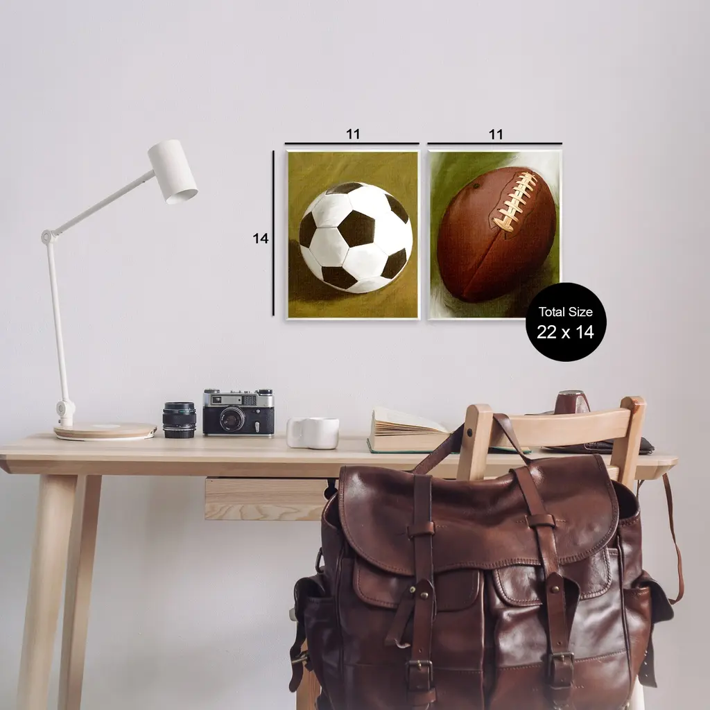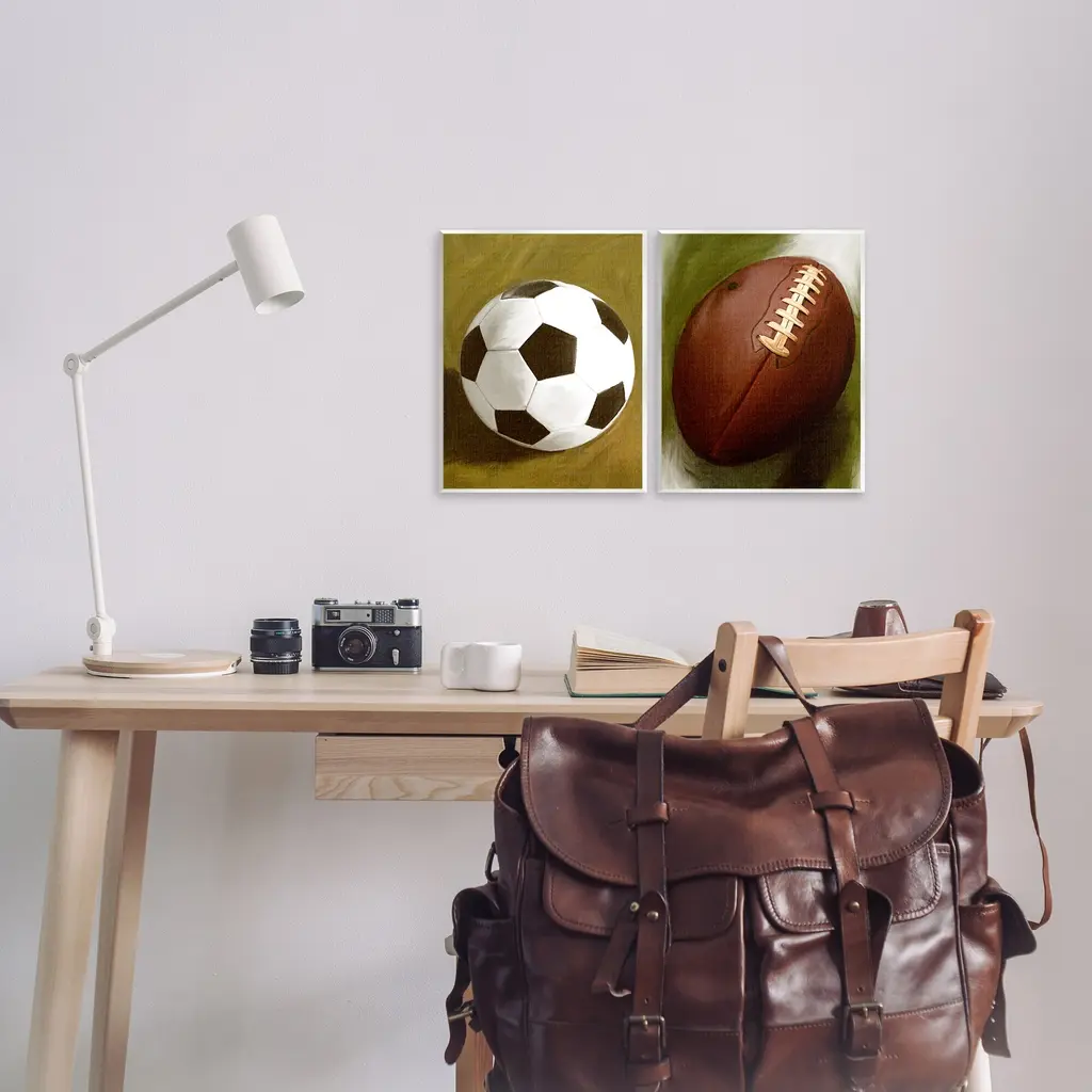 Fill any space with Stupell Wall Art Sets. Our wall plaques start as high-quality lithograph prints mounted on durable 0.5-inch thick MDF wood. Each piece is hand finished and comes with a fresh layer of white foil on the sides to give it a crisp, clean look. Plaques arrive ready to hang without installation and come with removable plastic corners to keep them from damage in transit. Stupell Wall Art is made in the USA.Features: Dimensions: 2 Piece Set, Each Panel is 11 x 0.5 x 14 InchesWall Art is Ready to Hang with Hardware Free Hanging. No installation required. For Easy Set Up Lean or Layer Artwork on Shelf or Against Wall.All of our wall plaques start off as high quality lithograph prints that are then mounted on durable 0.5 inch thick MDF wood. Each piece is hand finished and comes with a fresh layer of foil on the sides to give it a crisp clean look. Made In USA.Artwork Relates To: Sports, Team, Sport, Soccer, Ball, FootballDesign by Regina Moore