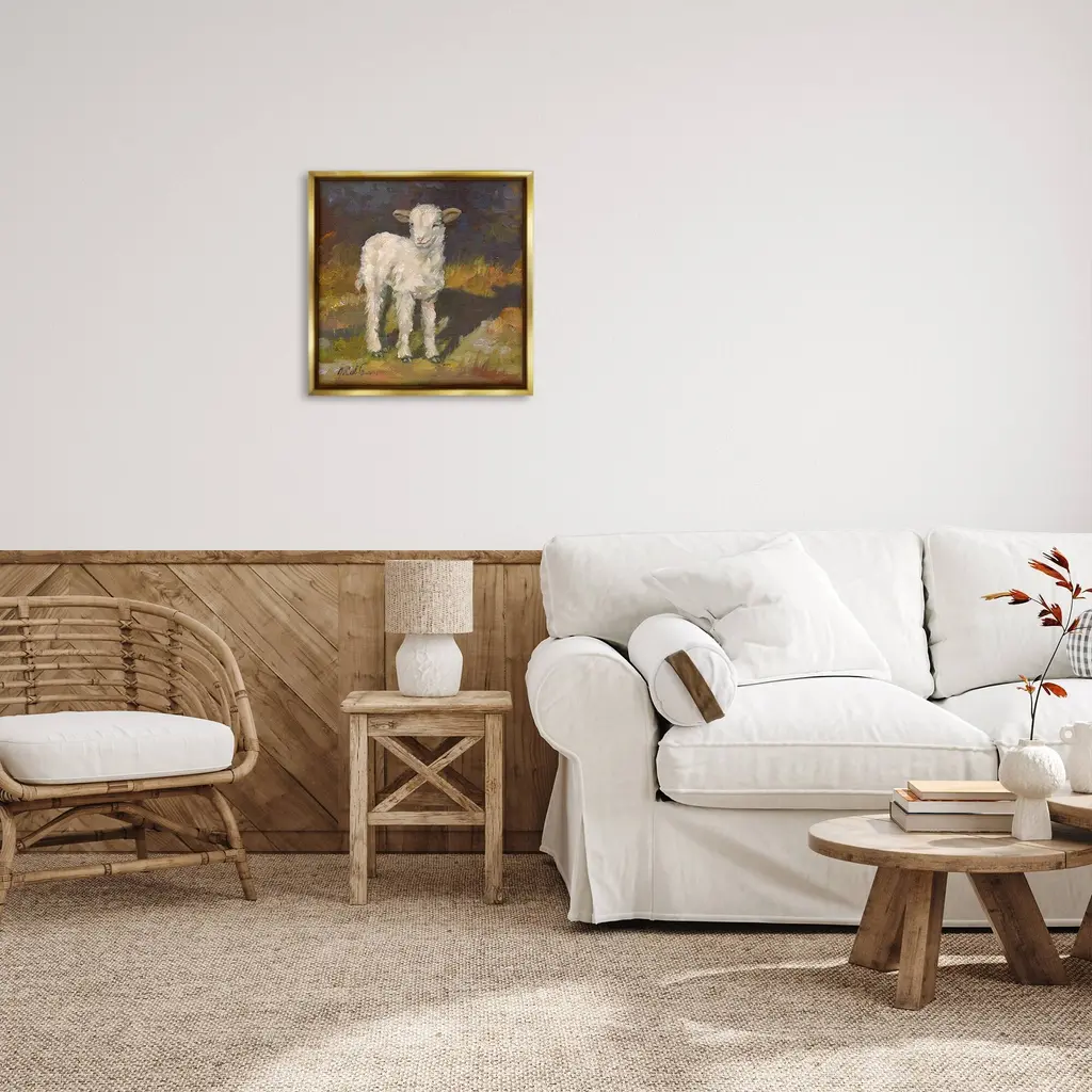 Elevate your home or office to the next level with Stupell Framed Floating Canvas Wall Art. Our premium hand-stretched canvas is mounted securely into a sturdy lightweight frame. The museum-style gap between the wrapped canvas and the box frame gives the illusion of floating artwork. Stupell Wall Art is made in the USA.Features: Dimensions: 18 x 1.7 x 18 Frame, 17 x 1.5 x 17 Canvas ArtFloating Frame Canvas Products are available in sizes 18"x18" and 25"x25". All Floating Frame Canvas Products have a 1.7" Depth.Wall Art is Ready to Hang with Hardware Free Hanging. No Installation required. For Easy Set Up Lean or Layer Artwork on Shelf or Against Wall. Artwork is Permently Fixed into the Frame.Our elevated 1.7" Thick Floating Frame is the perfect complement to our canvas style Wall Art. We use only the highest quality inks in house with industry leading printing solutions. Canvas is hand stretched over a durable wood foundation and then mounted securly into a Modern Box Frame. Made in the USA.Artwork Relates To: Animal, Farm, Country, Painting, Sheep, Lamb, FarmhouseDesign by Jerry Cable