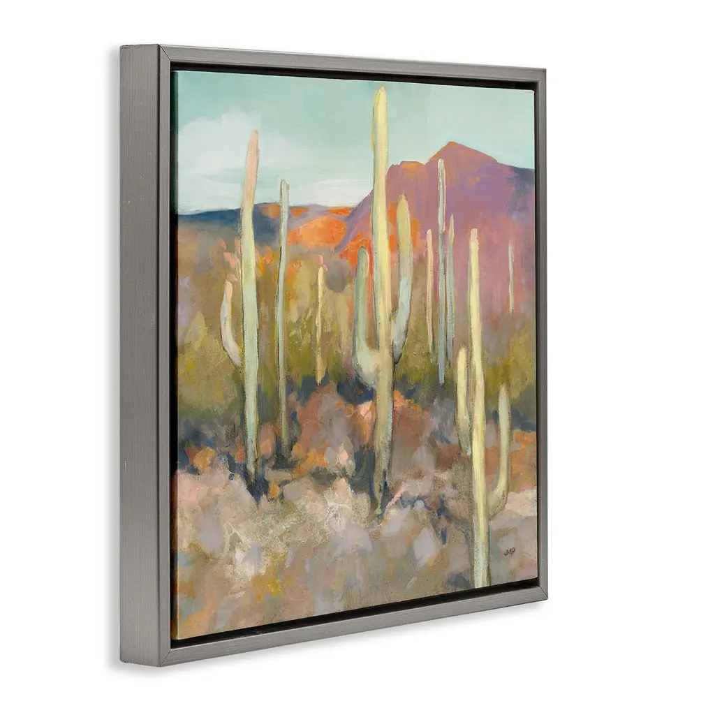 Elevate your home or office to the next level with Stupell Framed Floating Canvas Wall Art. Our premium hand-stretched canvas is mounted securely into a sturdy lightweight frame. The museum-style gap between the wrapped canvas and the box frame gives the illusion of floating artwork. Stupell Wall Art is made in the USA.Features: Dimensions: 18 x 1.7 x 18 Frame, 17 x 1.5 x 17 Canvas ArtFloating Frame Canvas Products are available in sizes 18"x18" and 25"x25". All Floating Frame Canvas Products have a 1.7" Depth.Wall Art is Ready to Hang with Hardware Free Hanging. No Installation required. For Easy Set Up Lean or Layer Artwork on Shelf or Against Wall. Artwork is Permently Fixed into the Frame.Our elevated 1.7" Thick Floating Frame is the perfect complement to our canvas style Wall Art. We use only the highest quality inks in house with industry leading printing solutions. Canvas is hand stretched over a durable wood foundation and then mounted securly into a Modern Box Frame. Made in the USA.Artwork Relates To: Cactus, Desert, Canyon, Landscape, Mountain, SouthwesternDesign by Julia Purinton