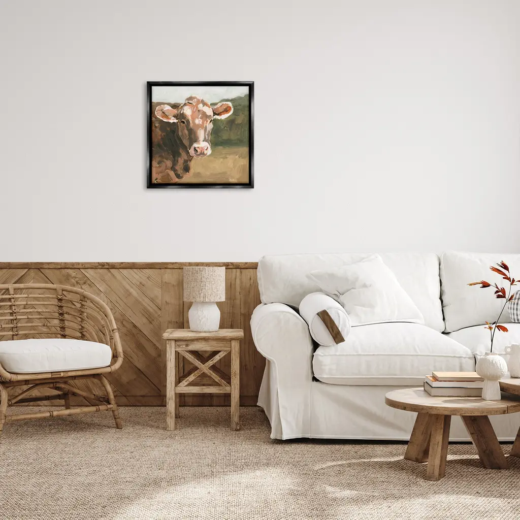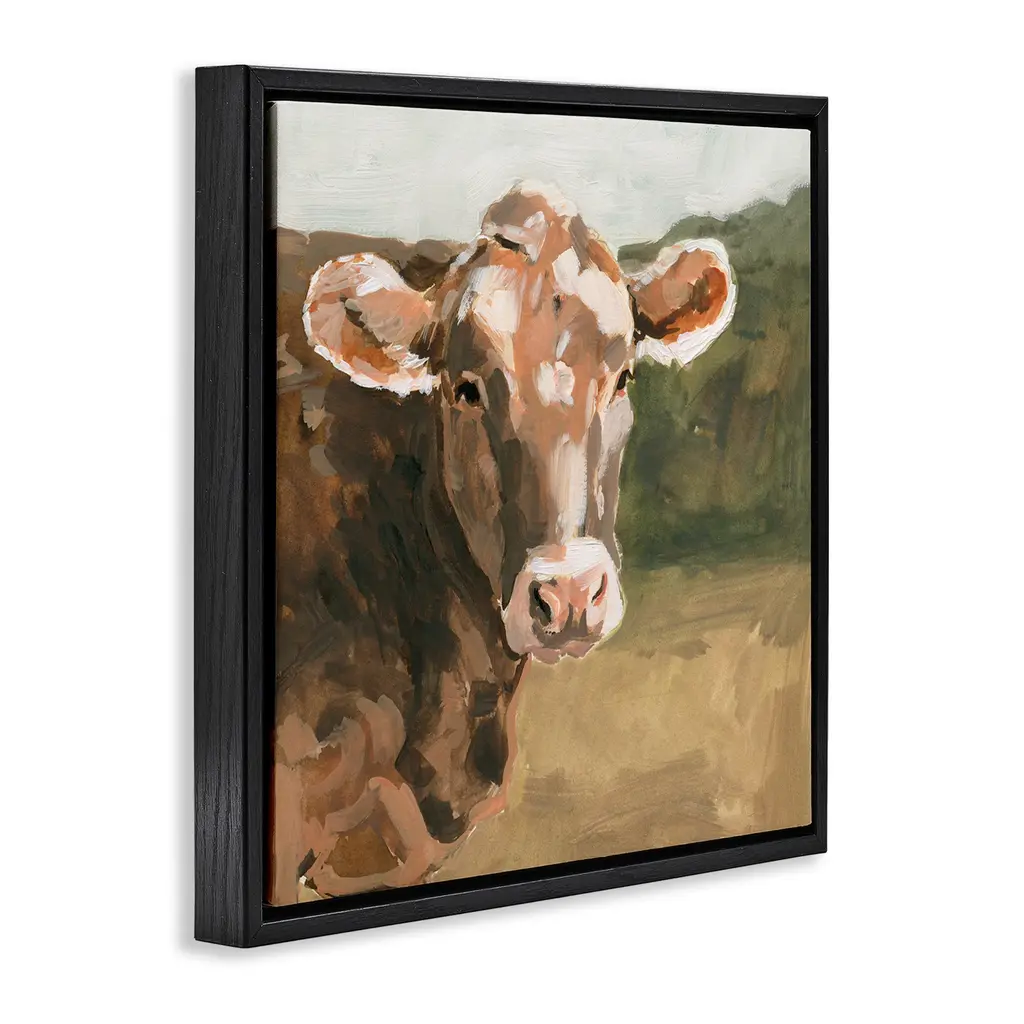 Elevate your home or office to the next level with Stupell Framed Floating Canvas Wall Art. Our premium hand-stretched canvas is mounted securely into a sturdy lightweight frame. The museum-style gap between the wrapped canvas and the box frame gives the illusion of floating artwork. Stupell Wall Art is made in the USA.Features: Dimensions: 18 x 1.7 x 18 Frame, 17 x 1.5 x 17 Canvas ArtFloating Frame Canvas Products are available in sizes 18"x18" and 25"x25". All Floating Frame Canvas Products have a 1.7" Depth.Wall Art is Ready to Hang with Hardware Free Hanging. No Installation required. For Easy Set Up Lean or Layer Artwork on Shelf or Against Wall. Artwork is Permently Fixed into the Frame.Our elevated 1.7" Thick Floating Frame is the perfect complement to our canvas style Wall Art. We use only the highest quality inks in house with industry leading printing solutions. Canvas is hand stretched over a durable wood foundation and then mounted securly into a Modern Box Frame. Made in the USA.Artwork Relates To: Animal, Country, Farmhouse, Cow, Cattle, Painting, TraditionalDesign by Victoria Barnes