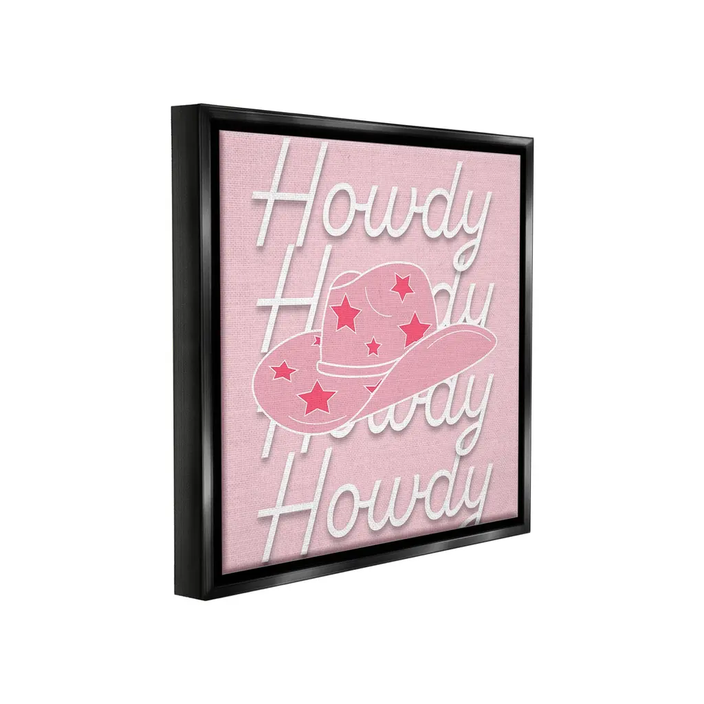 Elevate your home or office to the next level with Stupell Framed Floating Canvas Wall Art. Our premium hand-stretched canvas is mounted securely into a sturdy lightweight frame. The museum-style gap between the wrapped canvas and the box frame gives the illusion of floating artwork. Stupell Wall Art is made in the USA.Features: Dimensions: 18 x 1.7 x 18 Frame, 17 x 1.5 x 17 Canvas ArtFloating Frame Canvas Products are available in sizes 18"x18" and 25"x25". All Floating Frame Canvas Products have a 1.7" Depth.Wall Art is Ready to Hang with Hardware Free Hanging. No Installation required. For Easy Set Up Lean or Layer Artwork on Shelf or Against Wall. Artwork is Permently Fixed into the Frame.Our elevated 1.7" Thick Floating Frame is the perfect complement to our canvas style Wall Art. We use only the highest quality inks in house with industry leading printing solutions. Canvas is hand stretched over a durable wood foundation and then mounted securly into a Modern Box Frame. Made in the USA.Artwork Relates To: Equestrian, Rodeo, Country, Southwestern, Cowgirl, Cowboy Boot, Pink, Pastel, HowdyDesign by Corrine Rose Design