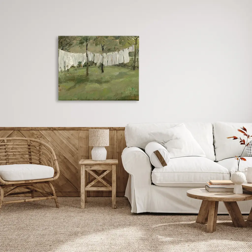 Proudly made in the USA, Our stretched canvas is created with the highest standards. We use only the highest quality inks and canvas on our in house Mimaki printers, and then hand cut and stretch each piece over a 1.5 inch thick wooden frame for hanging. The art comes ready to hang with no installation required.Features: Dimensions: 20 x 1.5 x 16 InchesStretched Canvas Sizes Include Standard: 20 x 1.5 x 16 Large: 30 x 1.5 x 20 X-Large: 40 x 1.5 x 30 Oversized: 48 x 1.5 x 36Wall Art is Ready to Hang - No Installation or Hardware Needed. For Easy Set Up Lean or Layer Artwork on Shelf or Against Wall.Our stretched canvas is created with the highest standards. We use only the highest quality inks and canvas on our in house Mimaki printers, and then hand cut and stretch each piece over a 1.5 inch thick wooden frame for hanging. Made In USA.Artwork Relates To: Painting, Grass, Plant, Outdoors, Tree, Wilderness, Nature, Clothesline, ClassicDesign by Lettered and Lined