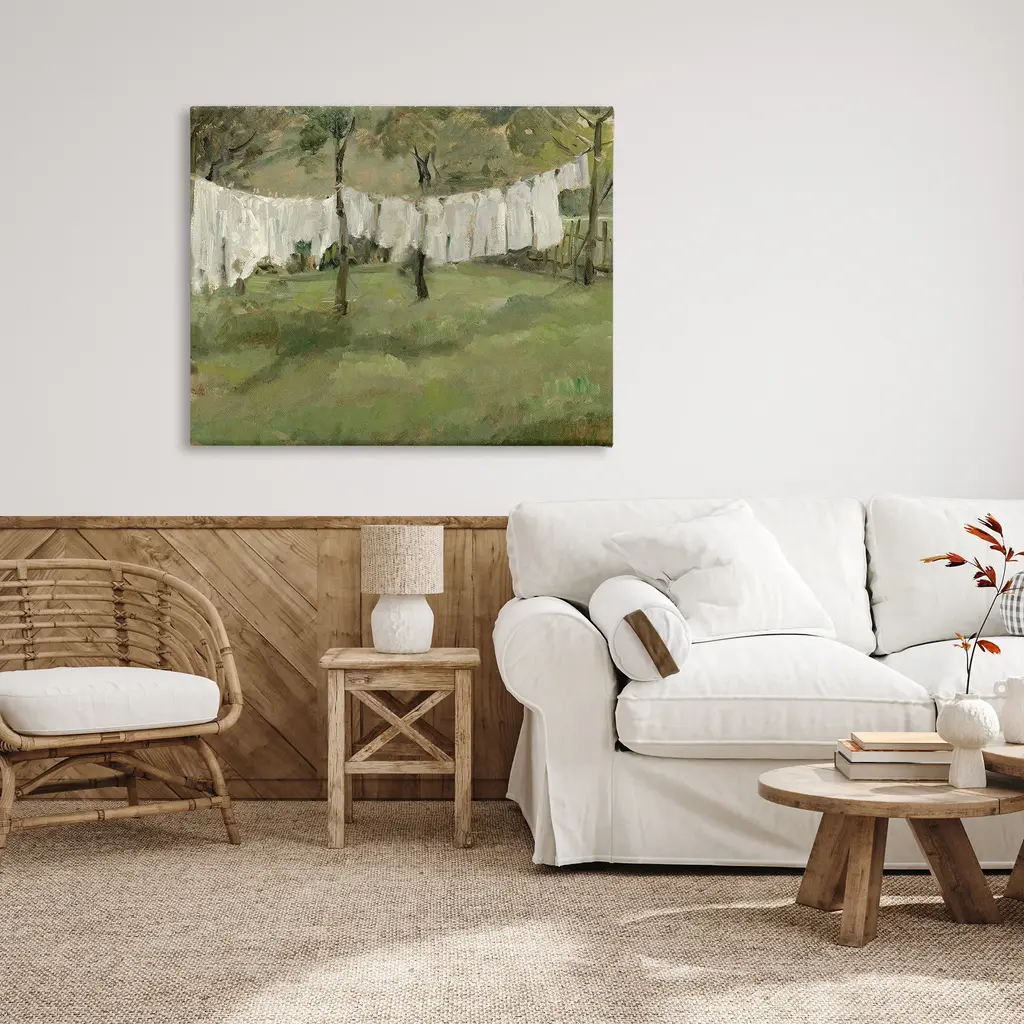 Proudly made in the USA, Our stretched canvas is created with the highest standards. We use only the highest quality inks and canvas on our in house Mimaki printers, and then hand cut and stretch each piece over a 1.5 inch thick wooden frame for hanging. The art comes ready to hang with no installation required.Features: Dimensions: 20 x 1.5 x 16 InchesStretched Canvas Sizes Include Standard: 20 x 1.5 x 16 Large: 30 x 1.5 x 20 X-Large: 40 x 1.5 x 30 Oversized: 48 x 1.5 x 36Wall Art is Ready to Hang - No Installation or Hardware Needed. For Easy Set Up Lean or Layer Artwork on Shelf or Against Wall.Our stretched canvas is created with the highest standards. We use only the highest quality inks and canvas on our in house Mimaki printers, and then hand cut and stretch each piece over a 1.5 inch thick wooden frame for hanging. Made In USA.Artwork Relates To: Painting, Grass, Plant, Outdoors, Tree, Wilderness, Nature, Clothesline, ClassicDesign by Lettered and Lined