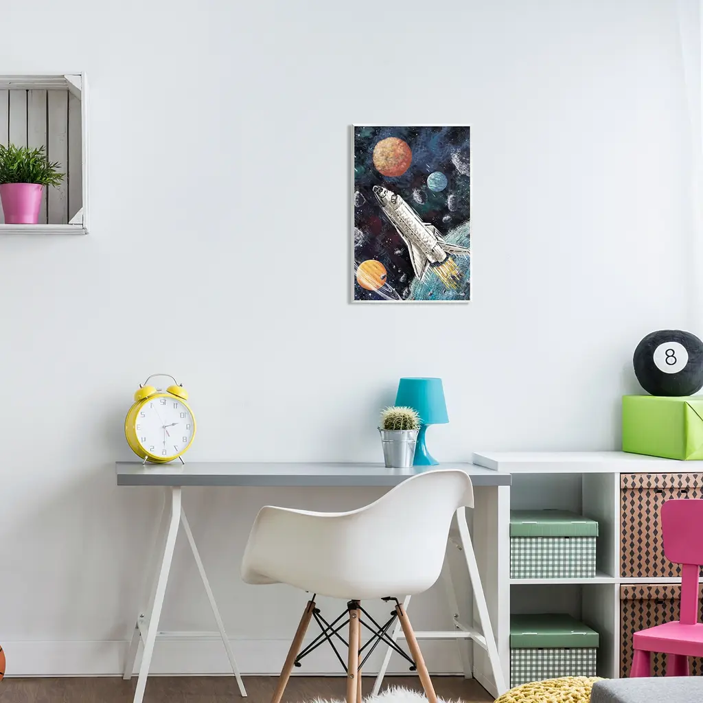Our wall plaques start as high-quality lithograph prints mounted on durable 0.5-inch thick MDF wood. Each piece is hand finished and comes with a fresh layer of white foil on the sides to give it a crisp, clean look. Plaques arrive ready to hang without installation and come with removable plastic corners to keep them from damage in transit. Stupell Industries Wall Art is made in the USA.Features: Dimensions: 10 x 0.5 x 15 InchesWall Plaque Sizes Include Standard: 10 x 0.5 x 15 Oversized: 13 x 0.5 x 19Wall Art is Ready to Hang with Hardware Free Hanging. No installation required. For Easy Set Up Lean or Layer Artwork on Shelf or Against Wall.All of our wall plaques start off as high quality lithograph prints that are then mounted on durable 0.5 inch thick MDF wood. Each piece is hand finished and comes with a fresh layer of foil on the sides to give it a crisp clean look. Made In USA.Artwork Relates To: Aircraft, Spaceship, Astronomy, Outer Space, Space Shuttle, Planet, AsteroidDesign by Nidhi Wadhwa