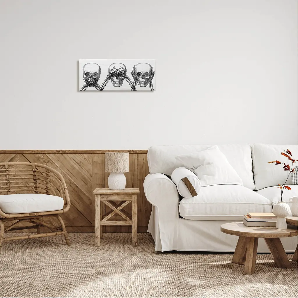 Proudly made in the USA, Our stretched canvas is created with the highest standards. We use only the highest quality inks and canvas on our in house Mimaki printers, and then hand cut and stretch each piece over a 1.5 inch thick wooden frame for hanging. The art comes ready to hang with no installation required. Not to mention, at this size, it is sure to be the focal point of any room!Features:Dimensions: 24 x 1.5 x 10 InchesStretched Canvas Sizes IncludeStandard: 24 x 1.5 x 10Large: 30 x 1.5 x 13X-Large: 40 x 1.5 x 17Oversized: 48 x 1.5 x 20Wall Art is Ready to Hang - No Installation or Hardware Needed. For Easy Set Up Lean or Layer Artwork on Shelf or Against Wall.Our stretched canvas is created with the highest standards. We use only the highest quality inks and canvas on our in house Mimaki printers, and then hand cut and stretch each piece over a 1.5 inch thick wooden frame for hanging. Made In USA.Artwork Relates To: Skull, Hear See Speak No Evil, Skeleton, HalloweenDesign by Lil' Rue