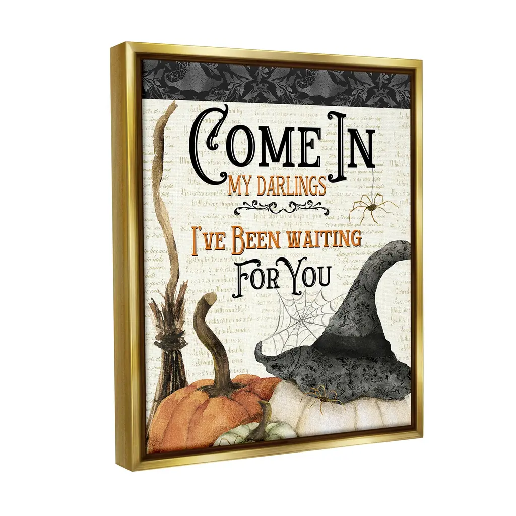 Elevate your home or office to the next level with Stupell Framed Floating Canvas Wall Art. Our premium hand-stretched canvas is mounted securely into a sturdy lightweight frame. The museum-style gap between the wrapped canvas and the box frame gives the illusion of floating artwork. Stupell Wall Art is made in the USA.Features: Dimensions: 17 x 1.7 x 21 Frame, 16 x 1.5 x 20 Canvas ArtFloating Frame Canvas Products are available in sizes 17"x21" and 25"x31". All Floating Frame Canvas Products have a 1.7" Depth.Wall Art is Ready to Hang with Hardware Free Hanging. No Installation required. For Easy Set Up Lean or Layer Artwork on Shelf or Against Wall. Artwork is Permently Fixed into the Frame.Our elevated 1.7" Thick Floating Frame is the perfect complement to our canvas style Wall Art. We use only the highest quality inks in house with industry leading printing solutions. Canvas is hand stretched over a durable wood foundation and then mounted securly into a Modern Box Frame. Made in the USA.Artwork Relates To: Cauldron, Witch, Broom, Halloween, Vintage, Rustic, Spider, Web, Pattern, Come In My Darlings I've Been Waiting For YouDesign by Deane Beesley