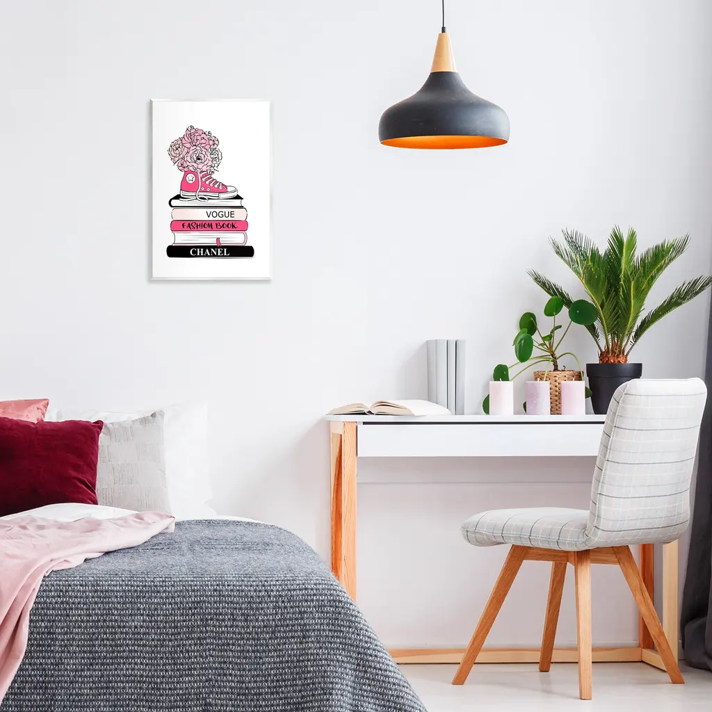 Our wall plaques start as high-quality lithograph prints mounted on durable 0.5-inch thick MDF wood. Each piece is hand finished and comes with a fresh layer of white foil on the sides to give it a crisp, clean look. Plaques arrive ready to hang without installation and come with removable plastic corners to keep them from damage in transit. Stupell Wall Art is made in the USA.Features: Dimensions: 10 x 0.5 x 15 InchesWall Plaque Product Sizes Include 10"x15" and 13"x19". All wall plaque products have a 0.5" Depth. Wall Art is Ready to Hang with Hardware Free Hanging. No installation required. For Easy Set Up Lean or Layer Artwork on Shelf or Against Wall.All of our wall plaques start off as high quality lithograph prints that are then mounted on durable 0.5 inch thick MDF wood. Each piece is hand finished and comes with a fresh layer of foil on the sides to give it a crisp clean look. Made In USA.Artwork Relates To: Glam, Fashion, Bookstack, Books, Sneaker, Shoe, Flower, FloralDesign by Martina Pavlova
