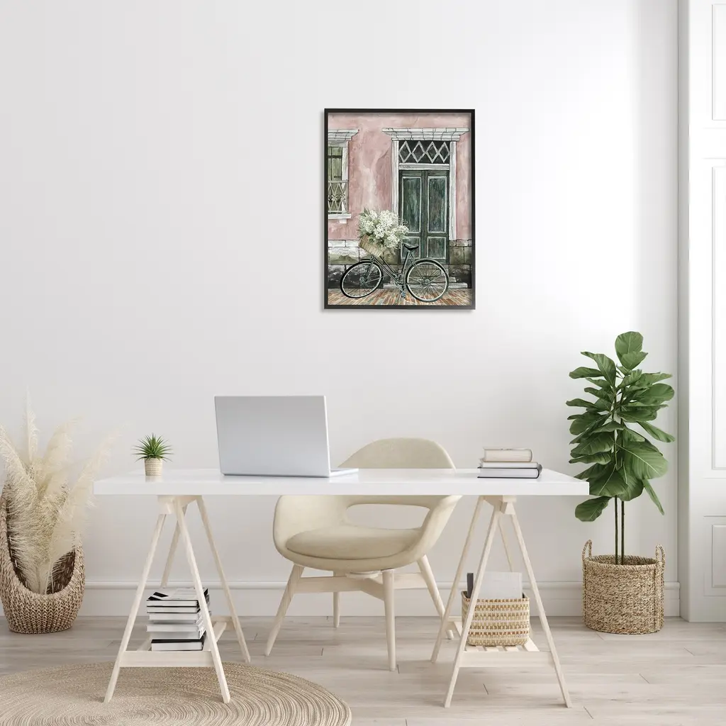 Stupell Spring Bicycle Lush Floral Bouquet Vintage City Architecture Framed Wall Art - Pink - 24 X 30 - Black