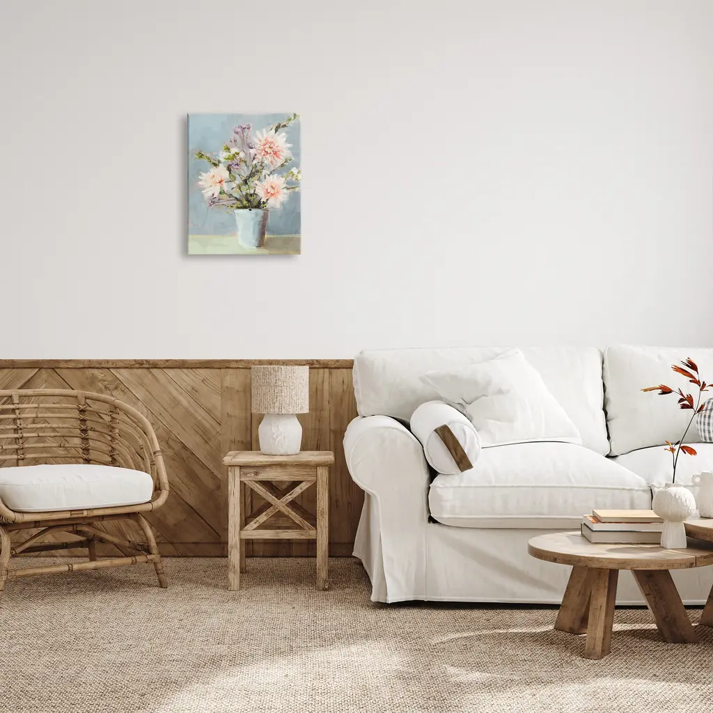 We create our stretched canvas to the highest standards. Using only the highest quality inks and canvas on Mimaki printers, we hand-cut and stretch each piece over a 1.5-inch thick wooden frame for hanging. As a result, the art comes ready to hang on the sturdy ledge with no installation required. Stupell Wall Art is made in the USA.Features: Dimensions: 16 x 1.5 x 20 InchesStretched Canvas Sizes Include Standard: 16 x 1.5 x 20 Large: 20 x 1.5 x 30 X-Large: 30 x 1.5 x 40 Oversized: 36 x 1.5 x 48Wall Art is Ready to Hang with Hardware Free Hanging. No installation required. For Easy Set Up Lean or Layer Artwork on Shelf or Against Wall.Our stretched canvas is created with the highest standards. We use only the highest quality inks and canvas on our in house Mimaki printers, and then hand cut and stretch each piece over a 1.5 inch thick wooden frame for hanging. Made In USA.Artwork Relates To: Painting, Dahlia, Flower, Plant, Flower Arrangement, Flower Bouquet, Jar, VaseDesign by Nina Blue