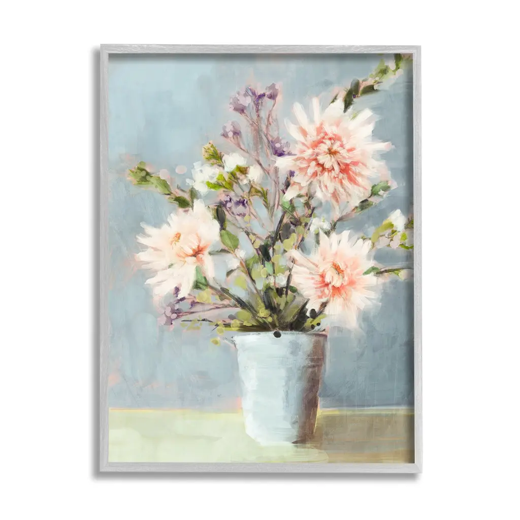 Add dimension to any room with our textured Framed Giclee Artwork. Our framed artwork is securely mounted into a 1.5-inch thick wood grain frame and ready to hang. Frames are available in three alluring styles: black, gray farmhouse and white. In addition, you should check out our oversized options if you want a statement piece. Stupell Wall Art is made in the USA.Features: Dimensions: 11 x 1.5 x 14 FramedFramed Giclee Sizes Include Standard: 11 x 1.5 x 14 Large: 16 x 1.5 x 20 Oversized: 24 x 1.5 x 30Wall Art is Ready to Hang with Hardware Free Hanging. No installation required. For Easy Set Up Lean or Layer Artwork on Shelf or Against Wall.Our giclée prints are carefully mounted on a durable MDF backing, and then perfectly finished in a 1.5 inch thick woodgrain frame. Mounted frame colors include black, gray farmhouse and white. Made In USA.Artwork Relates To: Painting, Dahlia, Flower, Plant, Flower Arrangement, Flower Bouquet, Jar, VaseDesign by Nina Blue