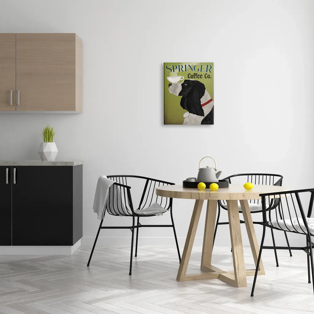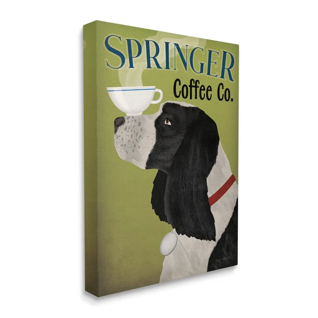 We create our stretched canvas to the highest standards. Using only the highest quality inks and canvas on Mimaki printers, we hand-cut and stretch each piece over a 1.5-inch thick wooden frame for hanging. As a result, the art comes ready to hang on the sturdy ledge with no installation required. Stupell Wall Art is made in the USA.Features: Dimensions: 16 x 1.5 x 20 InchesStretched Canvas Sizes Include Standard: 16 x 1.5 x 20 Large: 20 x 1.5 x 30 X-Large: 30 x 1.5 x 40 Oversized: 36 x 1.5 x 48Wall Art is Ready to Hang with Hardware Free Hanging. No installation required. For Easy Set Up Lean or Layer Artwork on Shelf or Against Wall.Our stretched canvas is created with the highest standards. We use only the highest quality inks and canvas on our in house Mimaki printers, and then hand cut and stretch each piece over a 1.5 inch thick wooden frame for hanging. Made In USA.Artwork Relates To: Dog, Animal, Mammal, Pet, Coffee, Springer Coffee CoDesign by Ryan Fowler