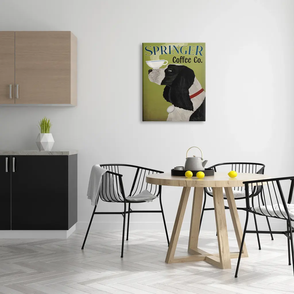 We create our stretched canvas to the highest standards. Using only the highest quality inks and canvas on Mimaki printers, we hand-cut and stretch each piece over a 1.5-inch thick wooden frame for hanging. As a result, the art comes ready to hang on the sturdy ledge with no installation required. Stupell Wall Art is made in the USA.Features: Dimensions: 16 x 1.5 x 20 InchesStretched Canvas Sizes Include Standard: 16 x 1.5 x 20 Large: 20 x 1.5 x 30 X-Large: 30 x 1.5 x 40 Oversized: 36 x 1.5 x 48Wall Art is Ready to Hang with Hardware Free Hanging. No installation required. For Easy Set Up Lean or Layer Artwork on Shelf or Against Wall.Our stretched canvas is created with the highest standards. We use only the highest quality inks and canvas on our in house Mimaki printers, and then hand cut and stretch each piece over a 1.5 inch thick wooden frame for hanging. Made In USA.Artwork Relates To: Dog, Animal, Mammal, Pet, Coffee, Springer Coffee CoDesign by Ryan Fowler