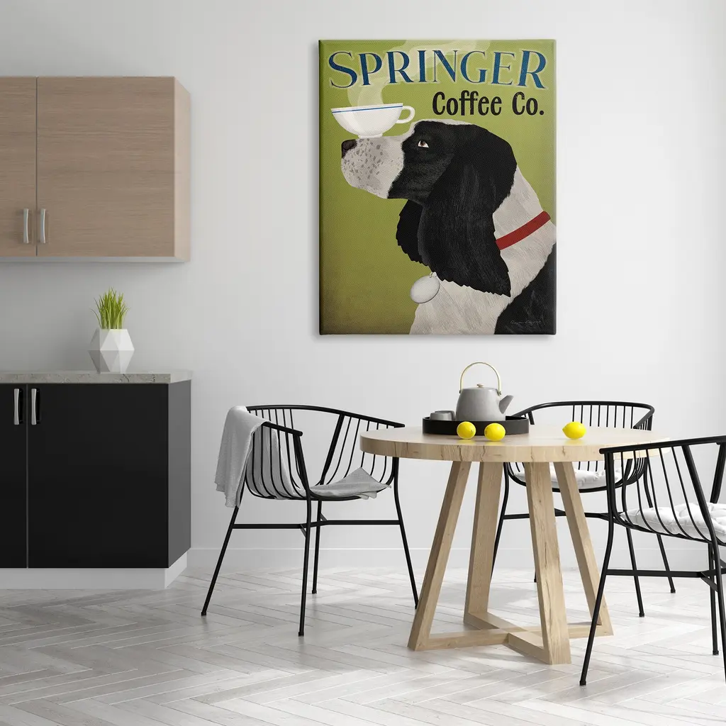 We create our stretched canvas to the highest standards. Using only the highest quality inks and canvas on Mimaki printers, we hand-cut and stretch each piece over a 1.5-inch thick wooden frame for hanging. As a result, the art comes ready to hang on the sturdy ledge with no installation required. Stupell Wall Art is made in the USA.Features: Dimensions: 16 x 1.5 x 20 InchesStretched Canvas Sizes Include Standard: 16 x 1.5 x 20 Large: 20 x 1.5 x 30 X-Large: 30 x 1.5 x 40 Oversized: 36 x 1.5 x 48Wall Art is Ready to Hang with Hardware Free Hanging. No installation required. For Easy Set Up Lean or Layer Artwork on Shelf or Against Wall.Our stretched canvas is created with the highest standards. We use only the highest quality inks and canvas on our in house Mimaki printers, and then hand cut and stretch each piece over a 1.5 inch thick wooden frame for hanging. Made In USA.Artwork Relates To: Dog, Animal, Mammal, Pet, Coffee, Springer Coffee CoDesign by Ryan Fowler