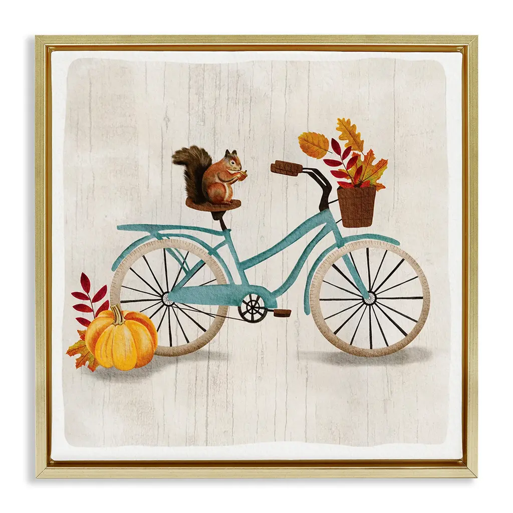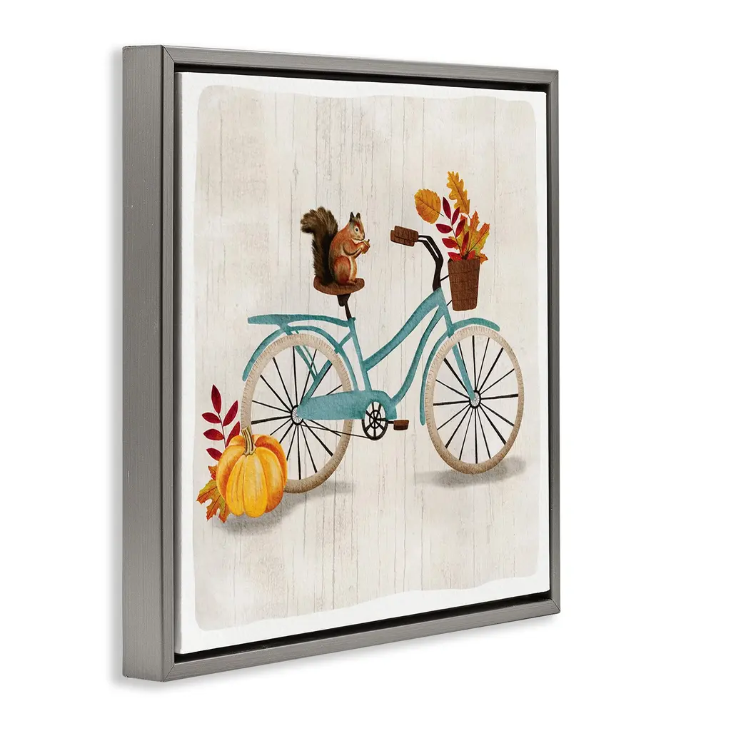 Elevate your home or office to the next level with Stupell Framed Floating Canvas Wall Art. Our premium hand-stretched canvas is mounted securely into a sturdy lightweight frame. The museum-style gap between the wrapped canvas and the box frame gives the illusion of floating artwork. Stupell Wall Art is made in the USA.Features: Dimensions: 18 x 1.7 x 18 Frame, 17 x 1.5 x 17 Canvas ArtFloating Frame Canvas Products are available in sizes 18"x18" and 25"x25". All Floating Frame Canvas Products have a 1.7" Depth.Wall Art is Ready to Hang with Hardware Free Hanging. No Installation required. For Easy Set Up Lean or Layer Artwork on Shelf or Against Wall. Artwork is Permently Fixed into the Frame.Our elevated 1.7" Thick Floating Frame is the perfect complement to our canvas style Wall Art. We use only the highest quality inks in house with industry leading printing solutions. Canvas is hand stretched over a durable wood foundation and then mounted securly into a Modern Box Frame. Made in the USA.Artwork Relates To: Seasonal, Fall, Autumn, Bicycle, Pumpkin, Botanical, SquirrelDesign by Jackie Quigley