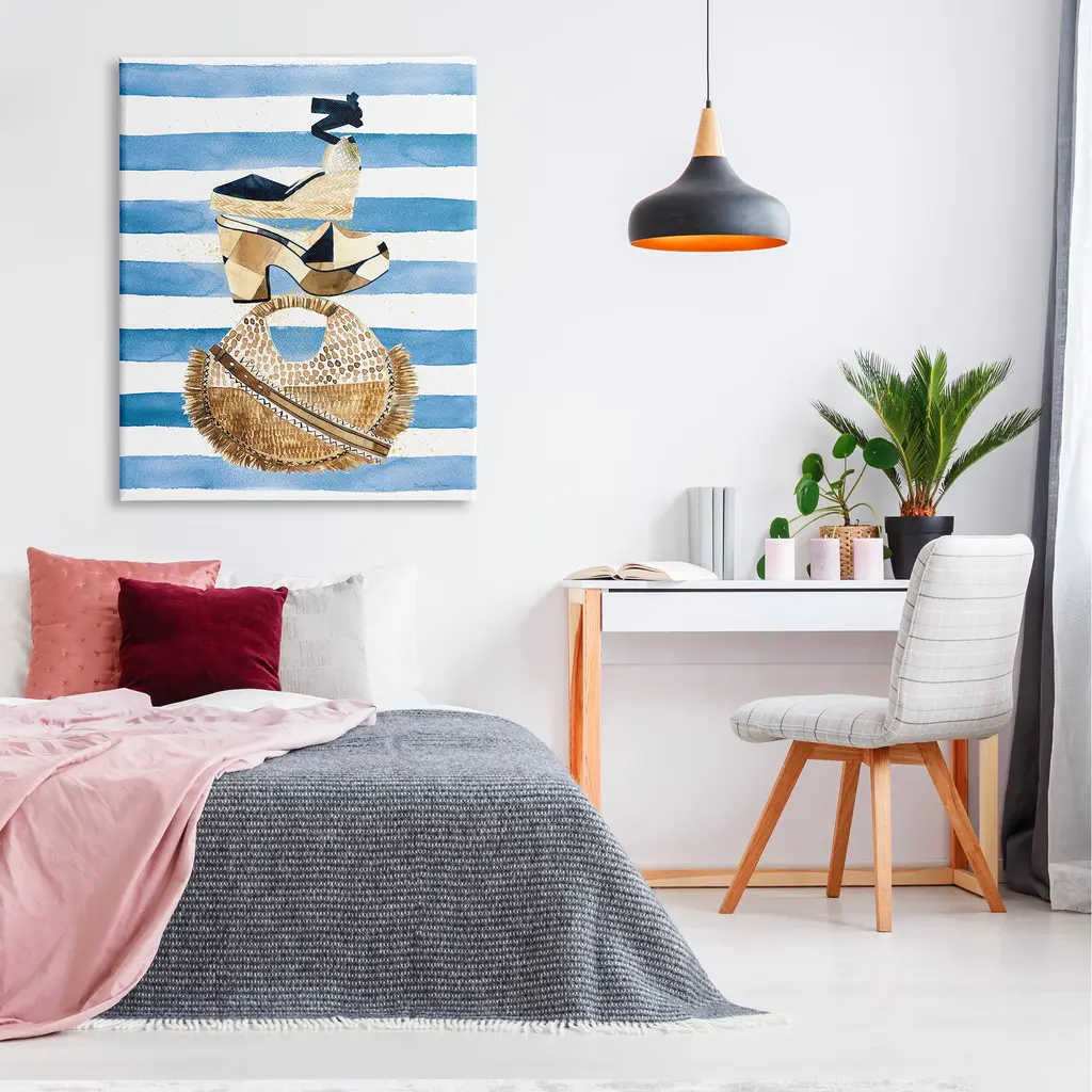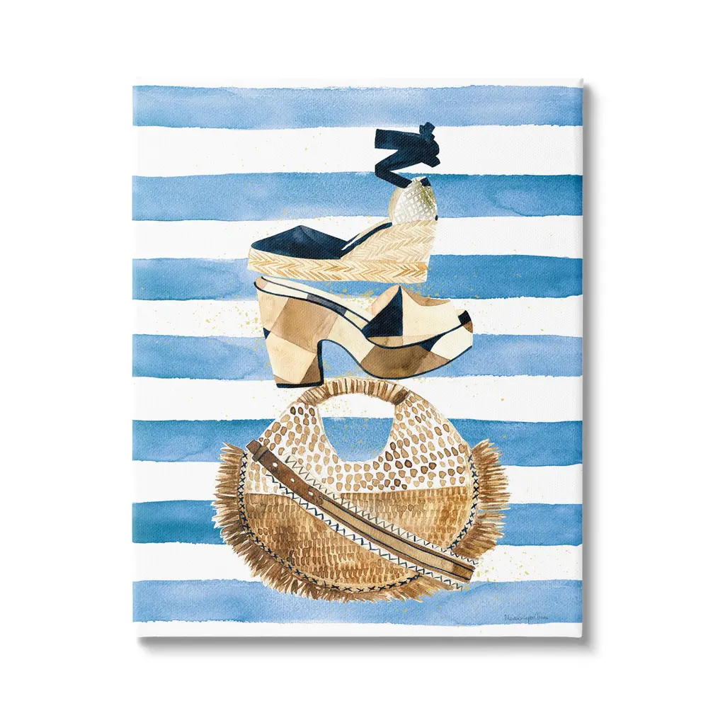 We create our stretched canvas to the highest standards. Using only the highest quality inks and canvas on Mimaki printers, we hand-cut and stretch each piece over a 1.5-inch thick wooden frame for hanging. As a result, the art comes ready to hang on the sturdy ledge with no installation required. Stupell Wall Art is made in the USA.Features: Dimensions: 16 x 1.5 x 20 InchesStretched Canvas Sizes Include Standard: 16 x 1.5 x 20 Large: 20 x 1.5 x 30 X-Large: 30 x 1.5 x 40 Oversized: 36 x 1.5 x 48Wall Art is Ready to Hang with Hardware Free Hanging. No installation required. For Easy Set Up Lean or Layer Artwork on Shelf or Against Wall.Our stretched canvas is created with the highest standards. We use only the highest quality inks and canvas on our in house Mimaki printers, and then hand cut and stretch each piece over a 1.5 inch thick wooden frame for hanging. Made In USA.Artwork Relates To: High Heel, Shoe, Handbag, Fashion, Glam, Blue, Stripes, PatternDesign by Mercedes Lopez Charro
