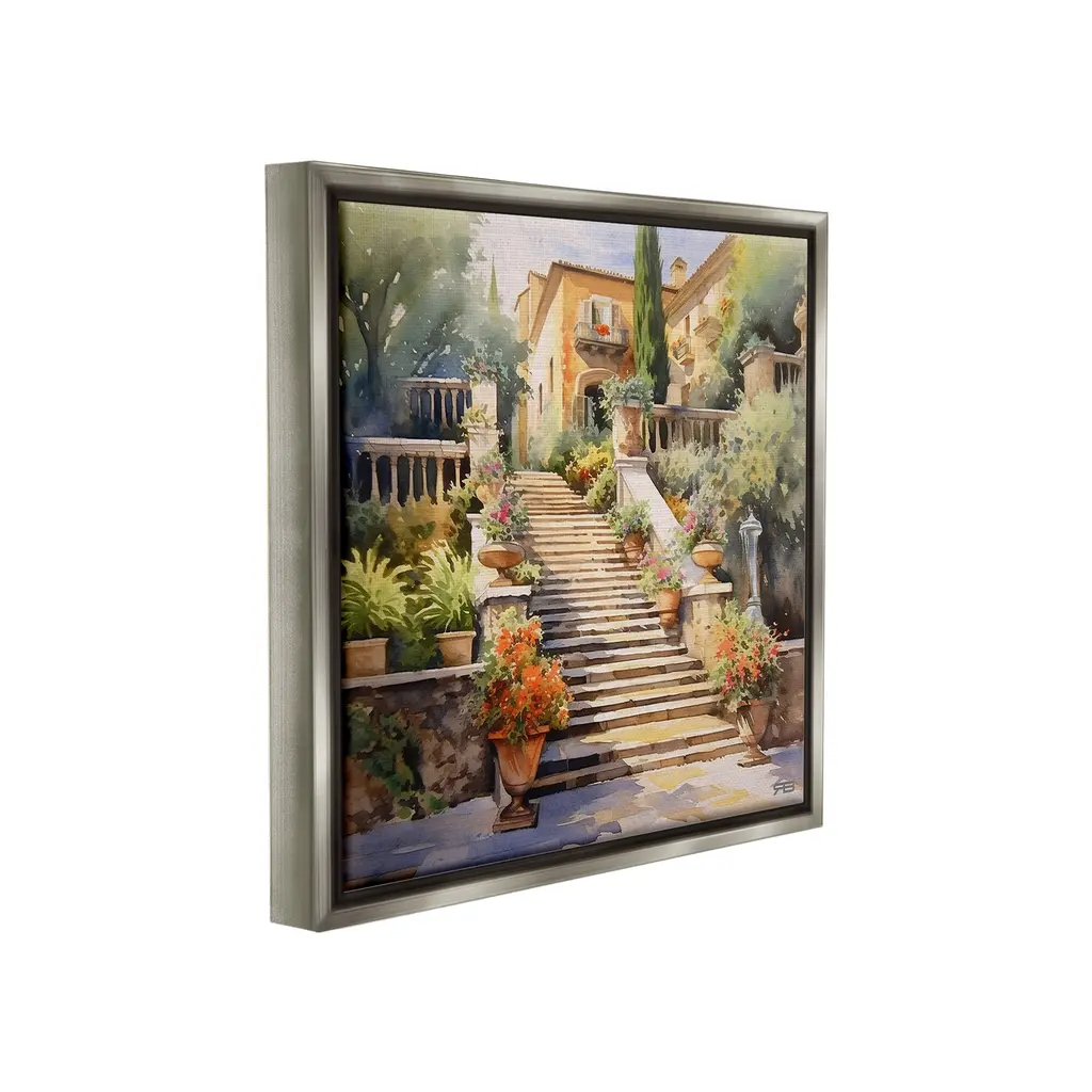 Elevate your home or office to the next level with Stupell Framed Floating Canvas Wall Art. Our premium hand-stretched canvas is mounted securely into a sturdy lightweight frame. The museum-style gap between the wrapped canvas and the box frame gives the illusion of floating artwork. Stupell Wall Art is made in the USA.Features: Dimensions: 18 x 1.7 x 18 Frame, 17 x 1.5 x 17 Canvas ArtFloating Frame Canvas Products are available in sizes 18"x18" and 25"x25". All Floating Frame Canvas Products have a 1.7" Depth.Wall Art is Ready to Hang with Hardware Free Hanging. No Installation required. For Easy Set Up Lean or Layer Artwork on Shelf or Against Wall. Artwork is Permently Fixed into the Frame.Our elevated 1.7" Thick Floating Frame is the perfect complement to our canvas style Wall Art. We use only the highest quality inks in house with industry leading printing solutions. Canvas is hand stretched over a durable wood foundation and then mounted securly into a Modern Box Frame. Made in the USA.Artwork Relates To: Architecture, Building, House, Villa, Staircase, Plant, Potted Plant, Hacienda, Garden, Nature, City, Road, Street, Flower, Cottage, Town, EuropeanDesign by RB